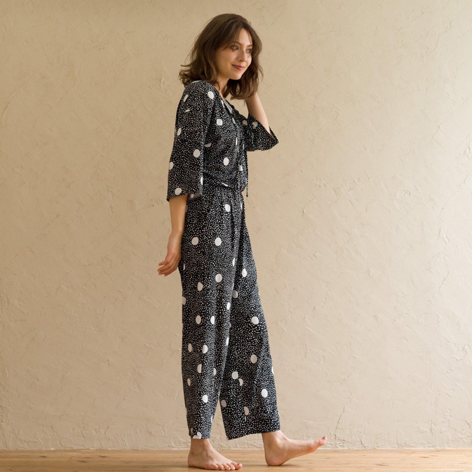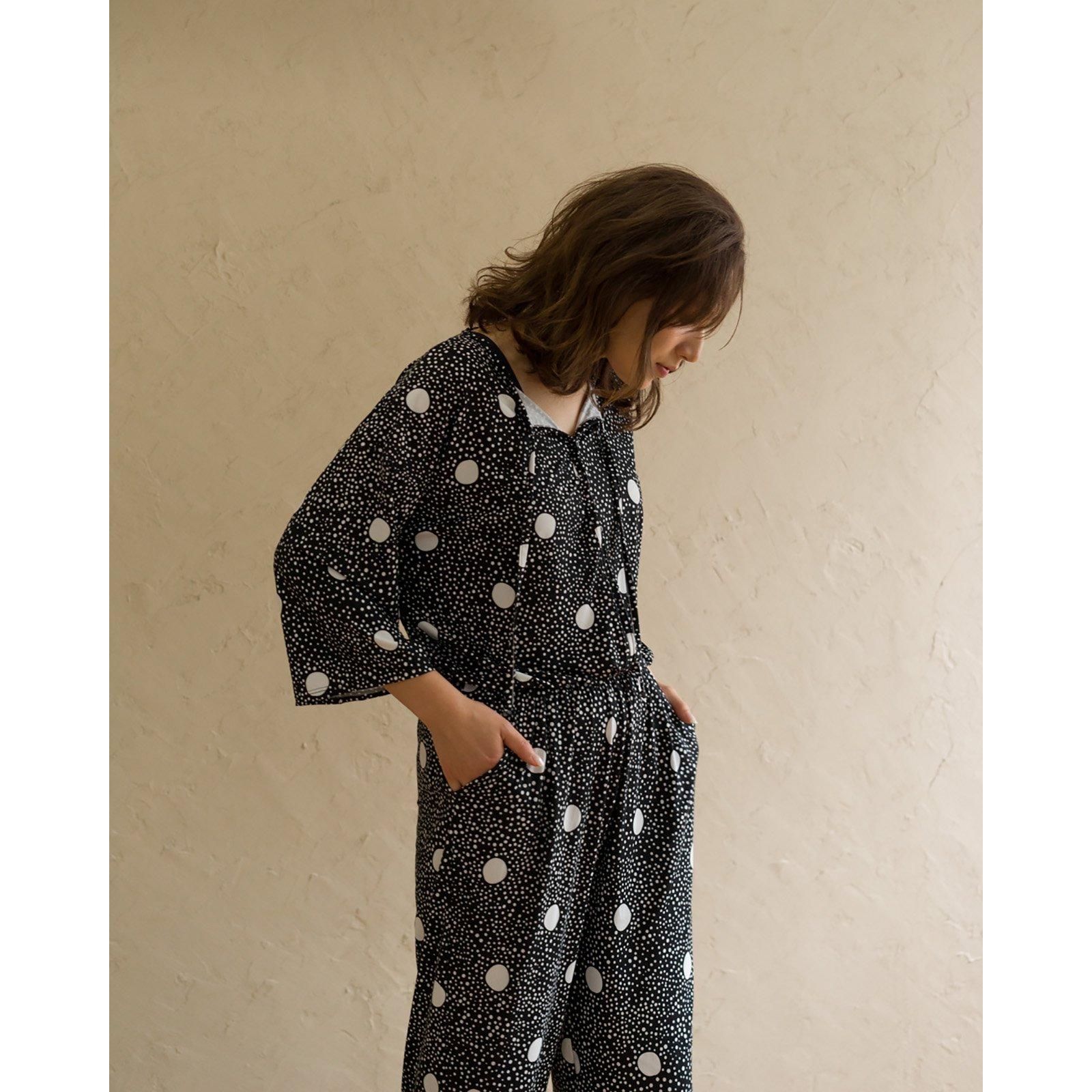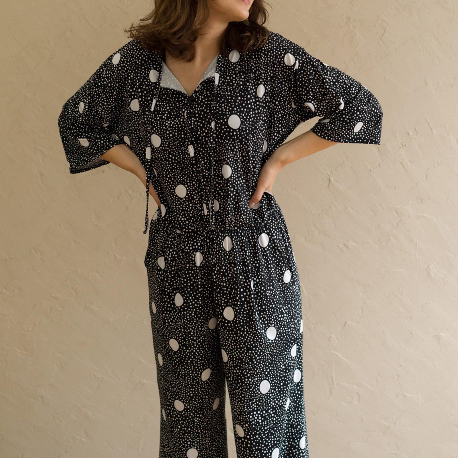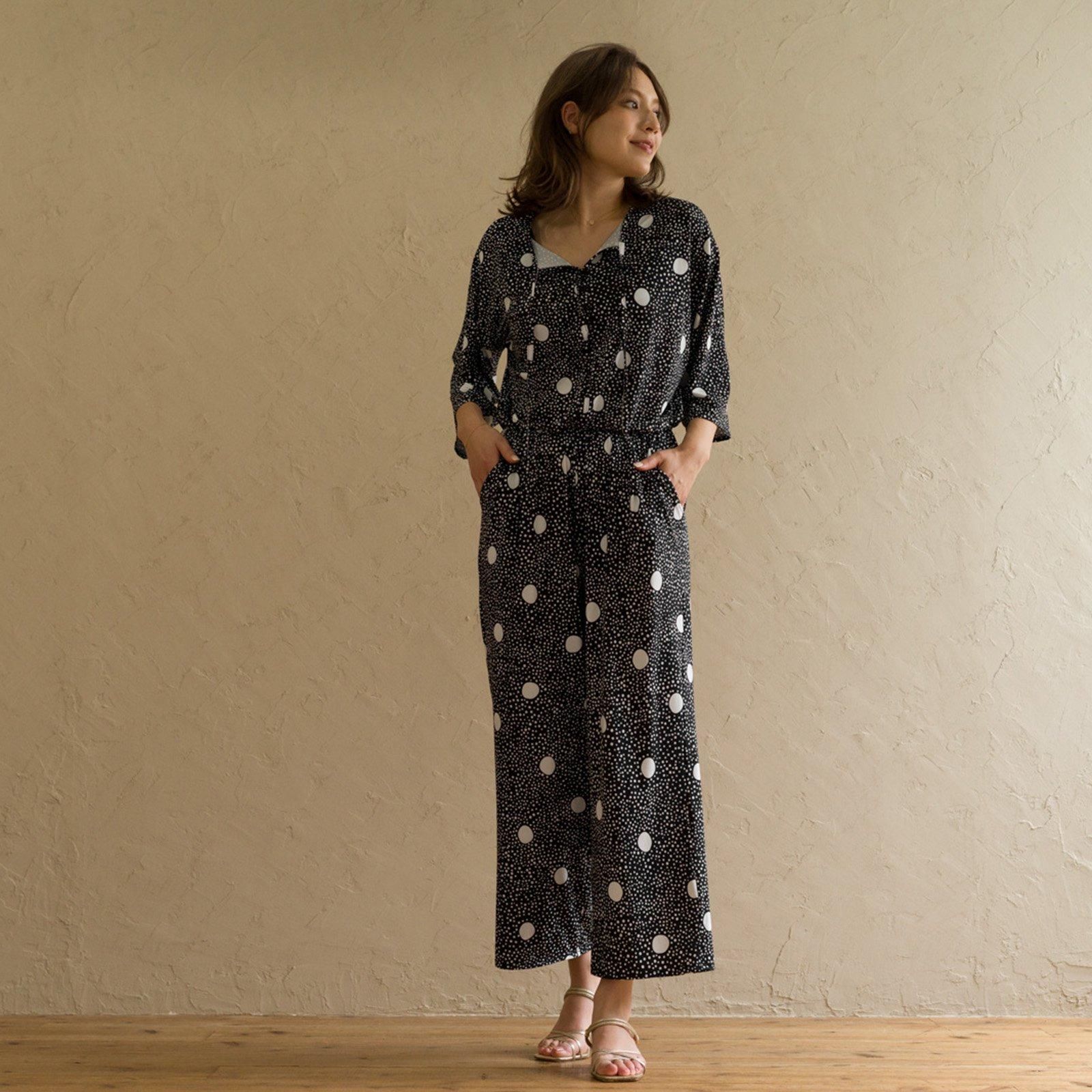 ウェストはゴム仕様でストレスのない着心地。ストンと落ち感があるので、すっきりスタイル良く見せてくれます。胸元はボタン仕様で開き具合を調節可能。