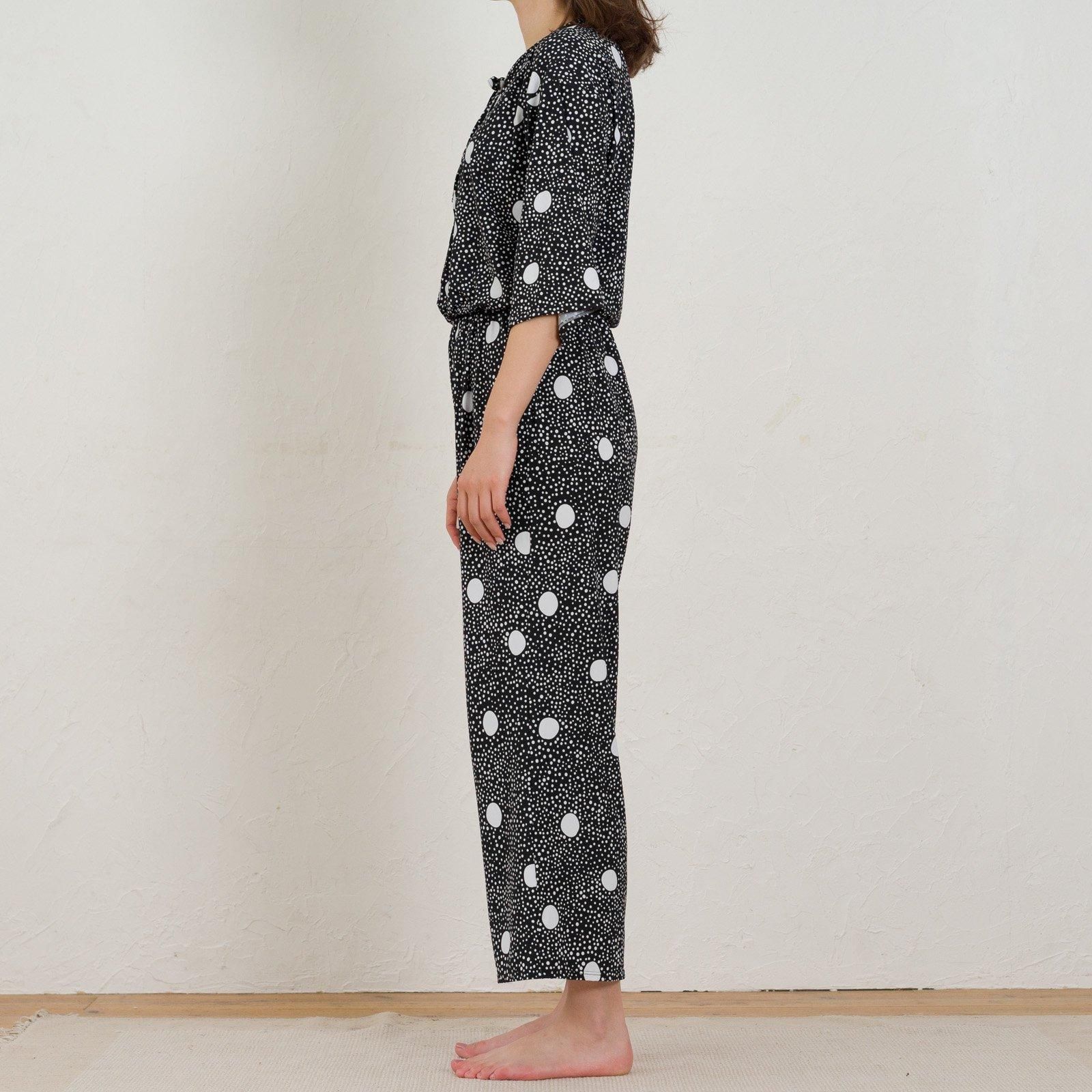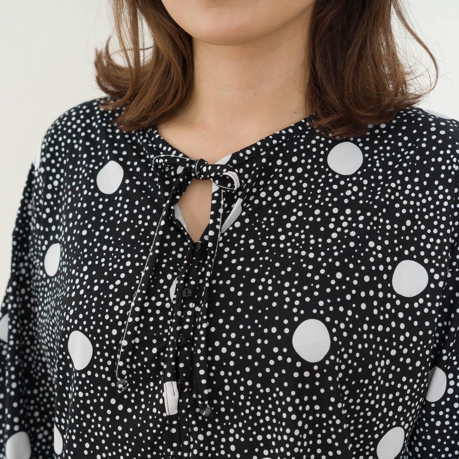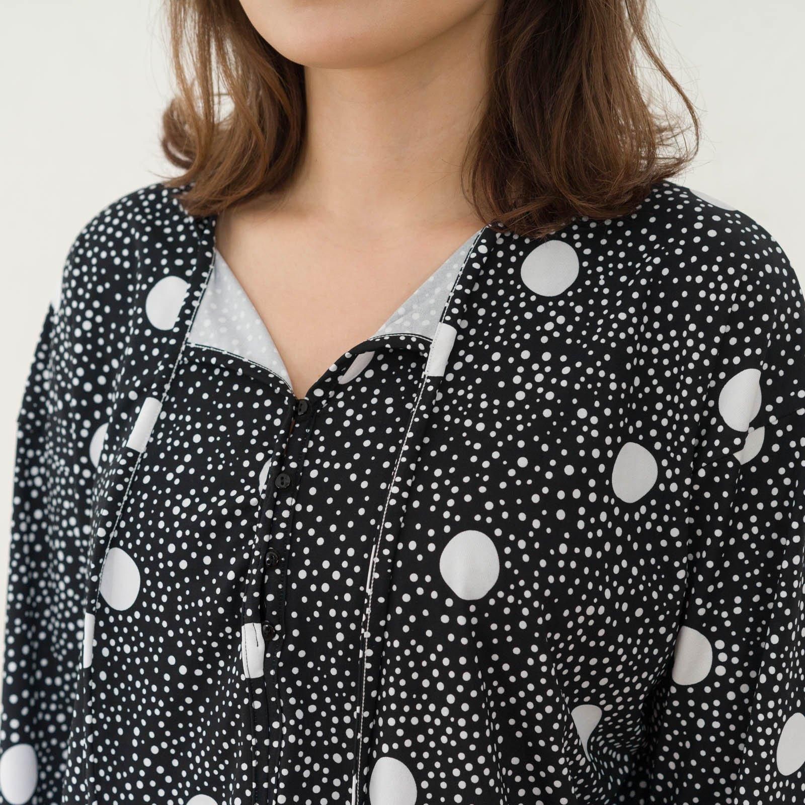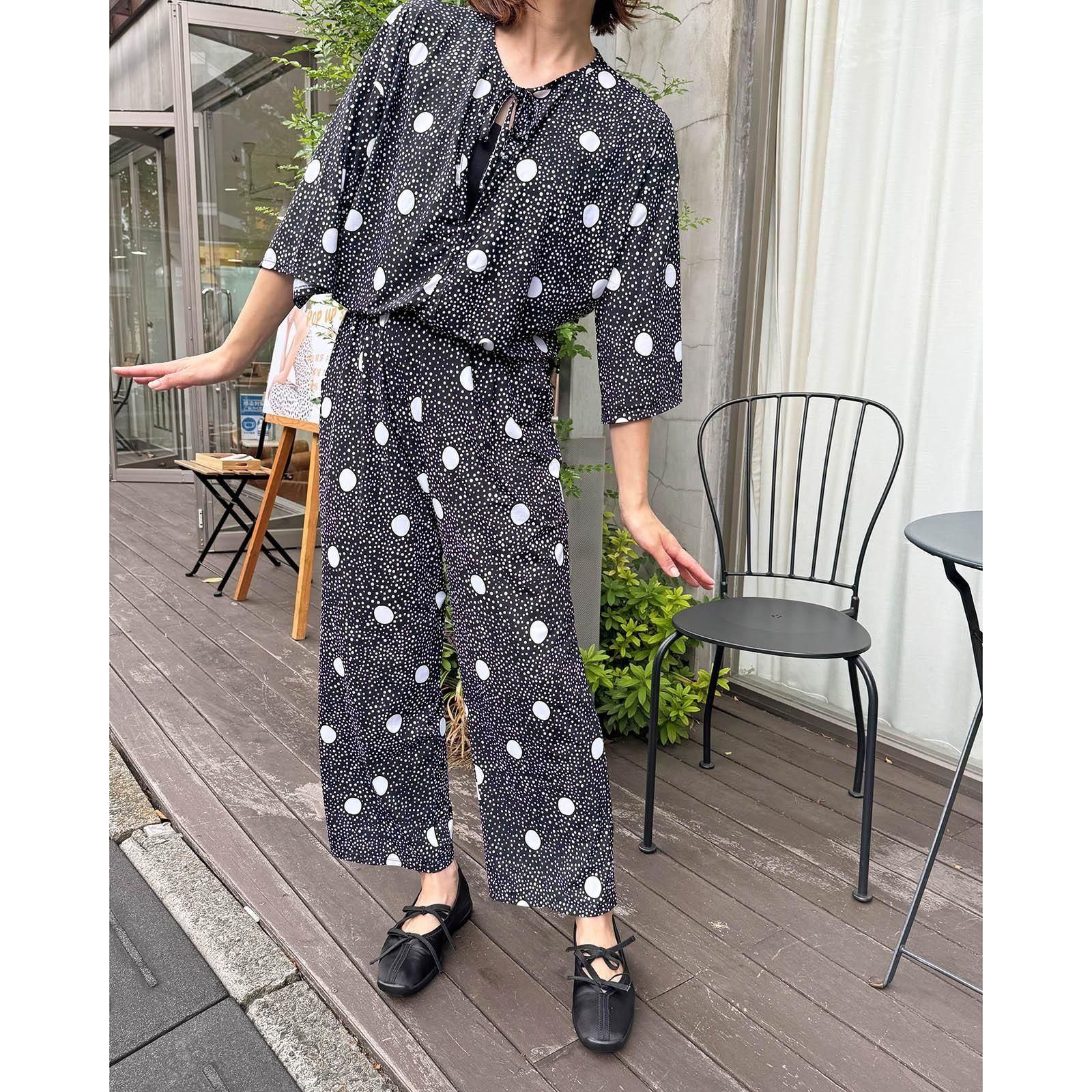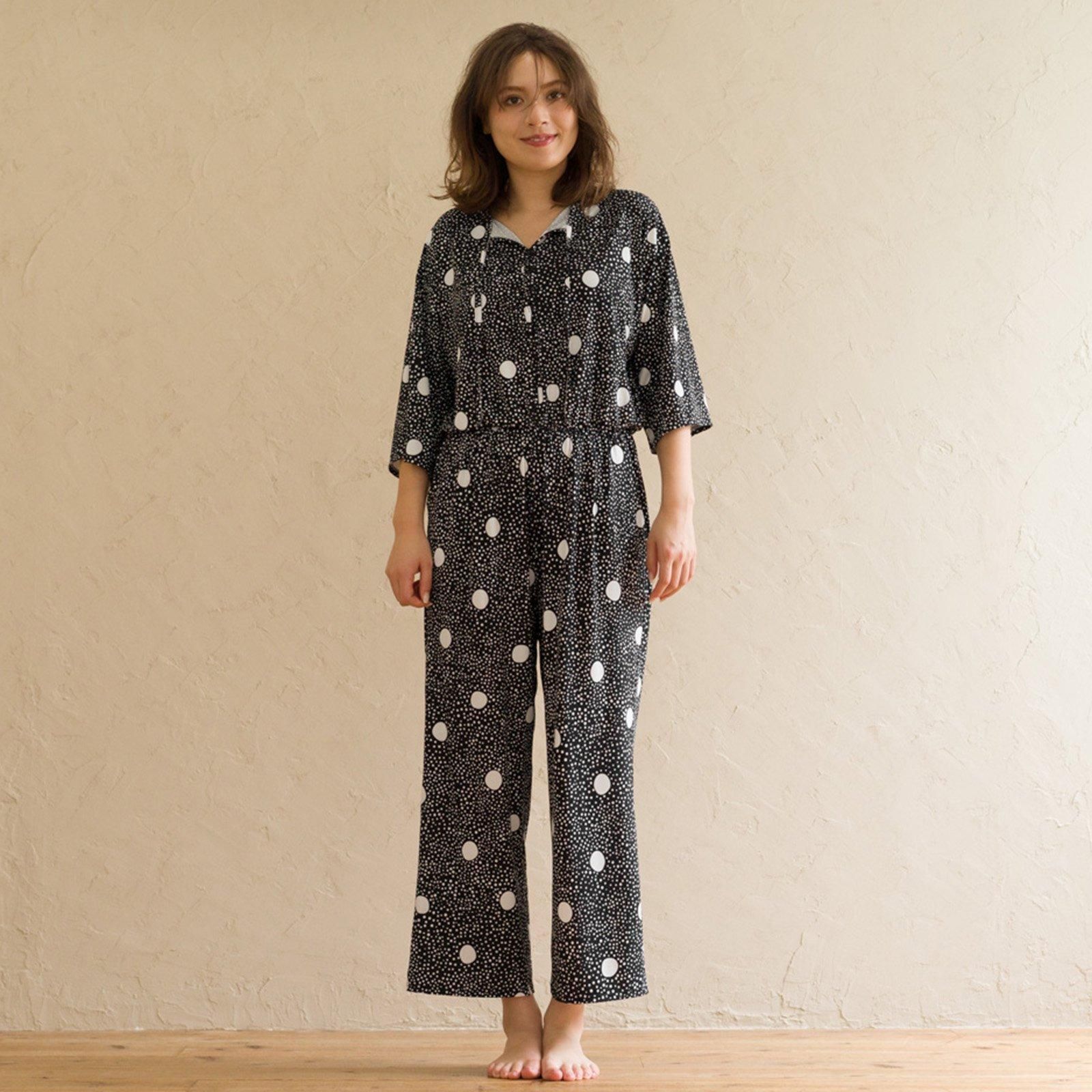 ウェストはゴム仕様でストレスのない着心地。ストンと落ち感があるので、すっきりスタイル良く見せてくれます。胸元はボタン仕様で開き具合を調節可能。