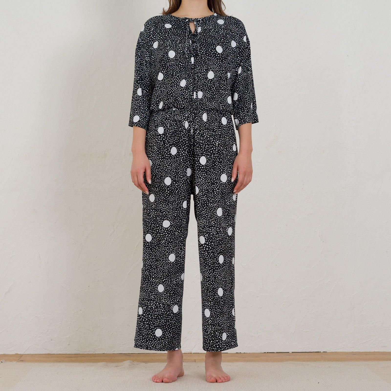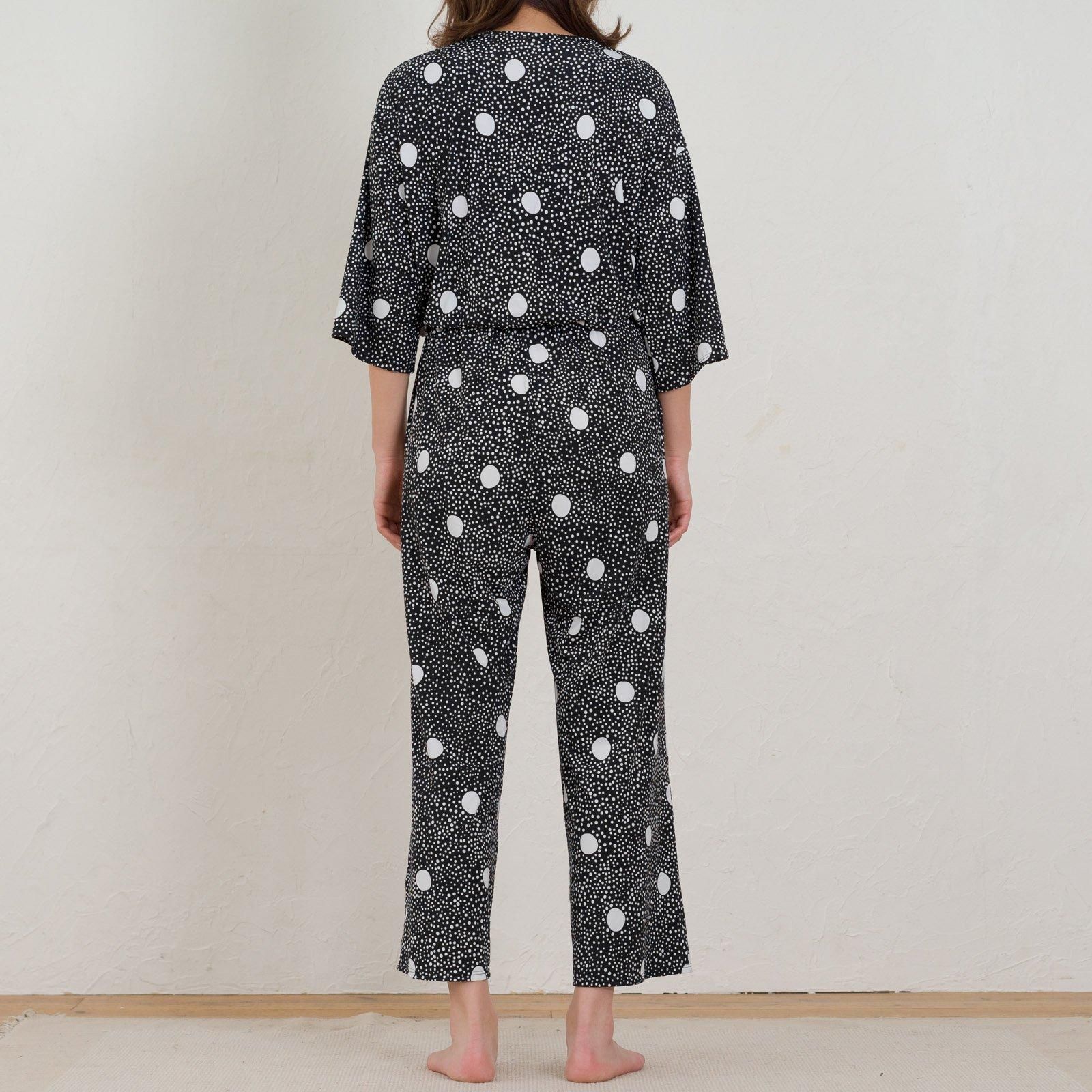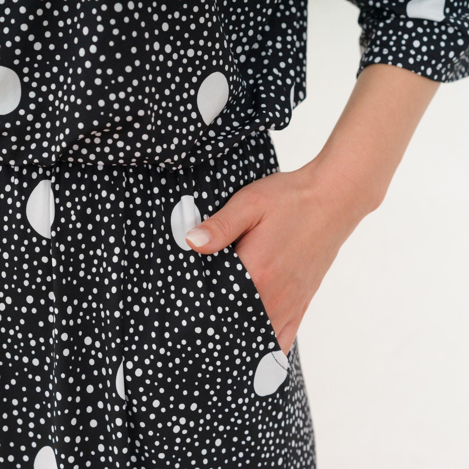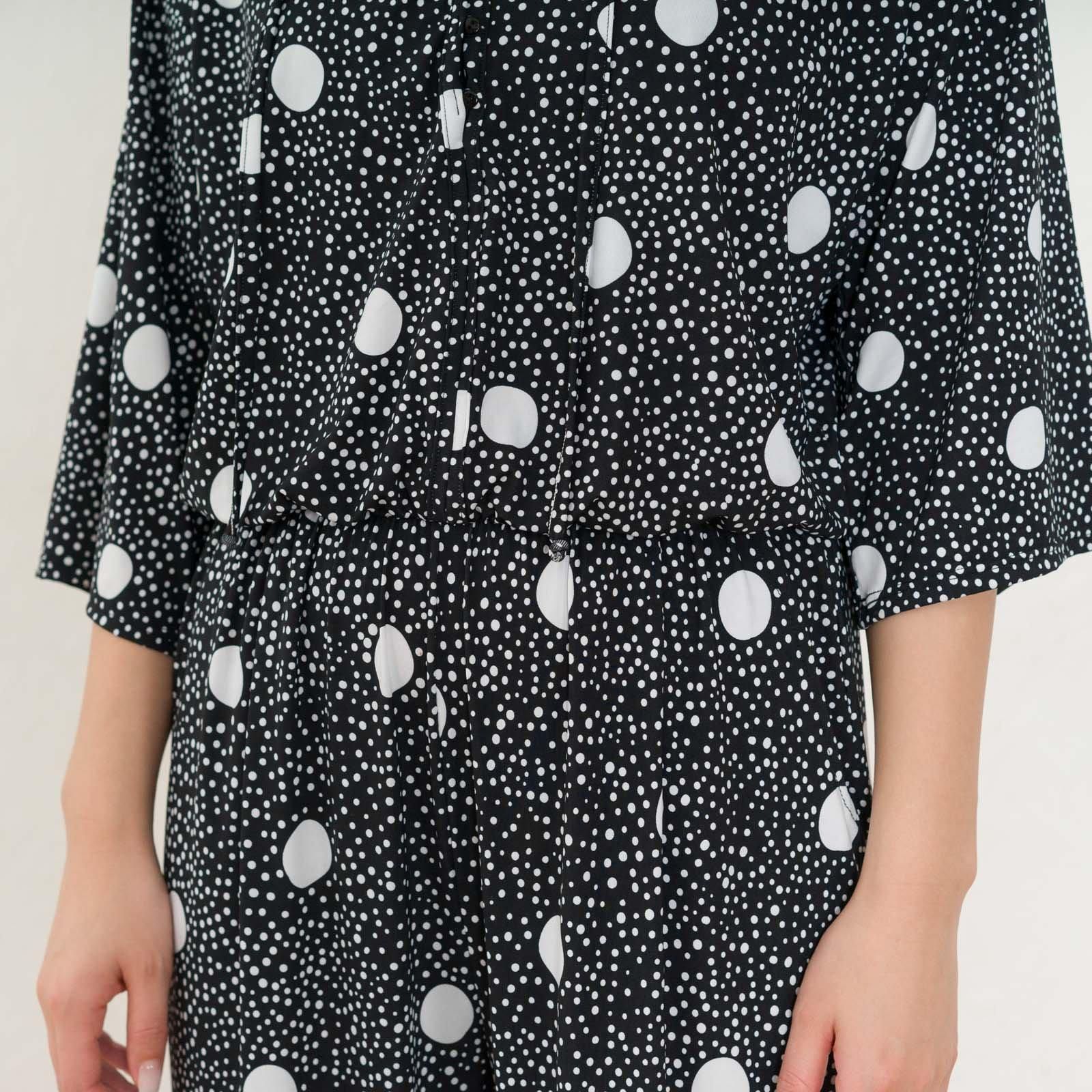 ウェストはゴム仕様でストレスのない着心地。ストンと落ち感があるので、すっきりスタイル良く見せてくれます。胸元はボタン仕様で開き具合を調節可能。
