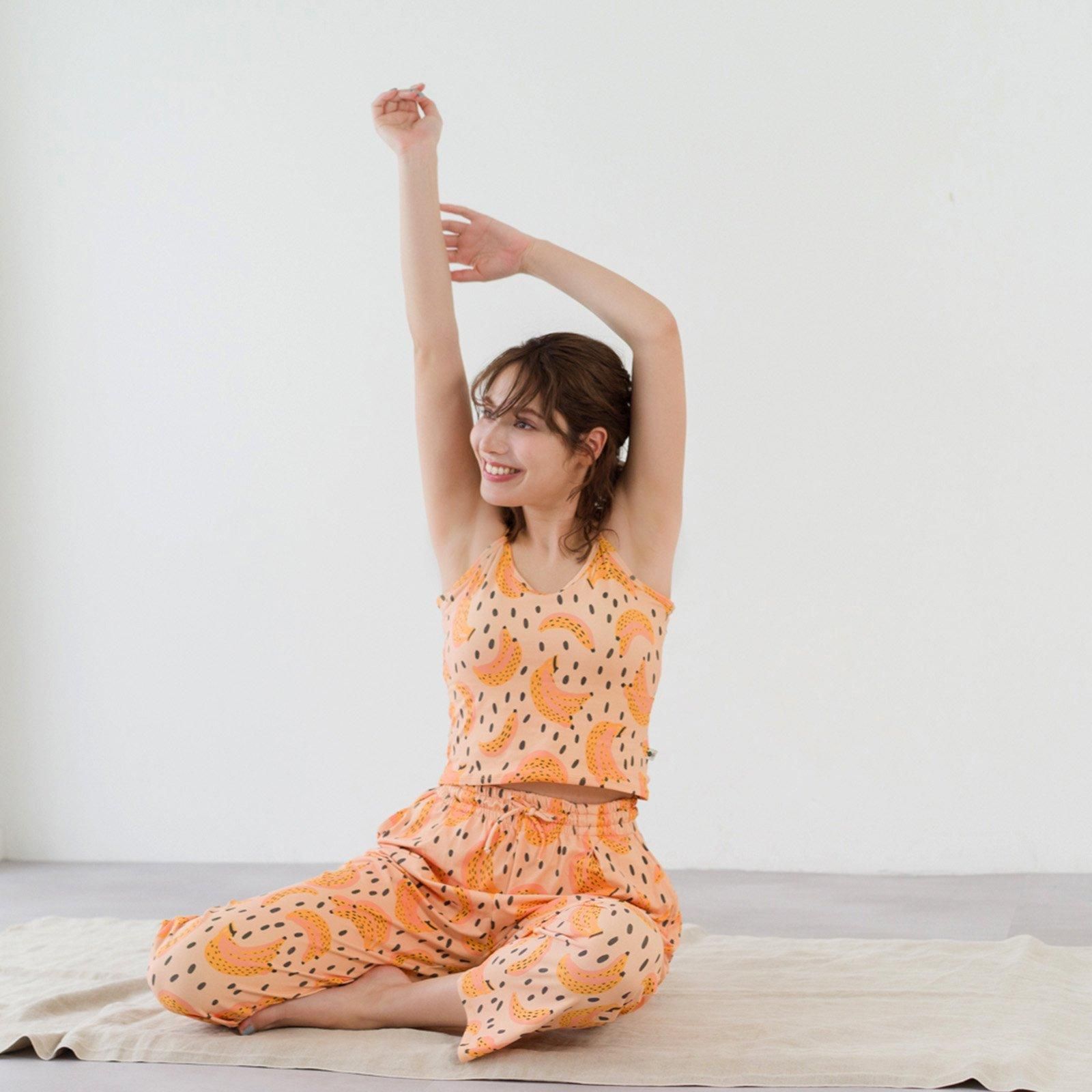 ウェストはゴム仕様、長めのウェスト紐をつけています。柄レギンスと同じ素材を採用、ストレッチ性が高く柔らかな素材は動きやすさ抜群です。ポケット付き。ヨガシーンはもちろん、デイリーにも、使い勝手のいいパンツです。