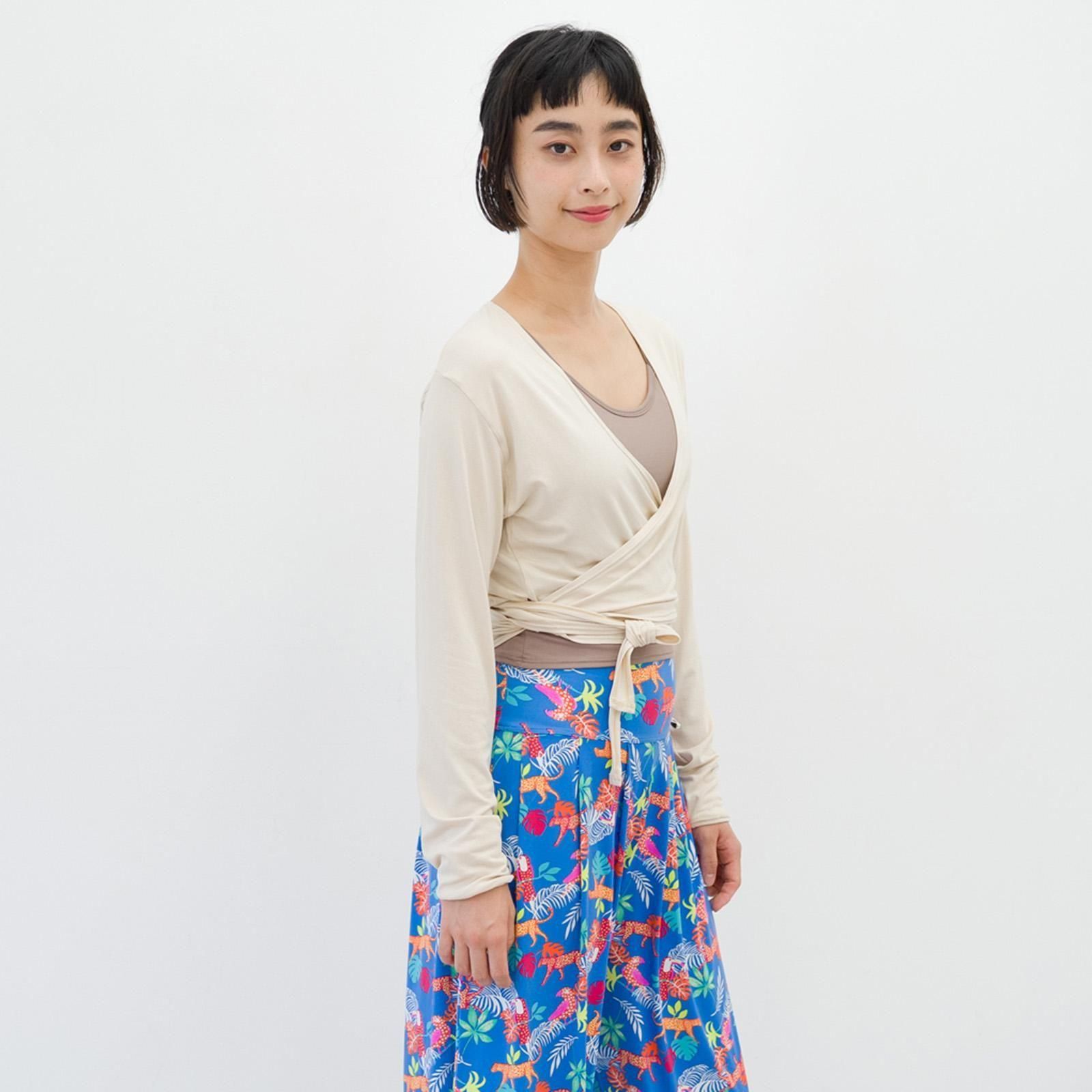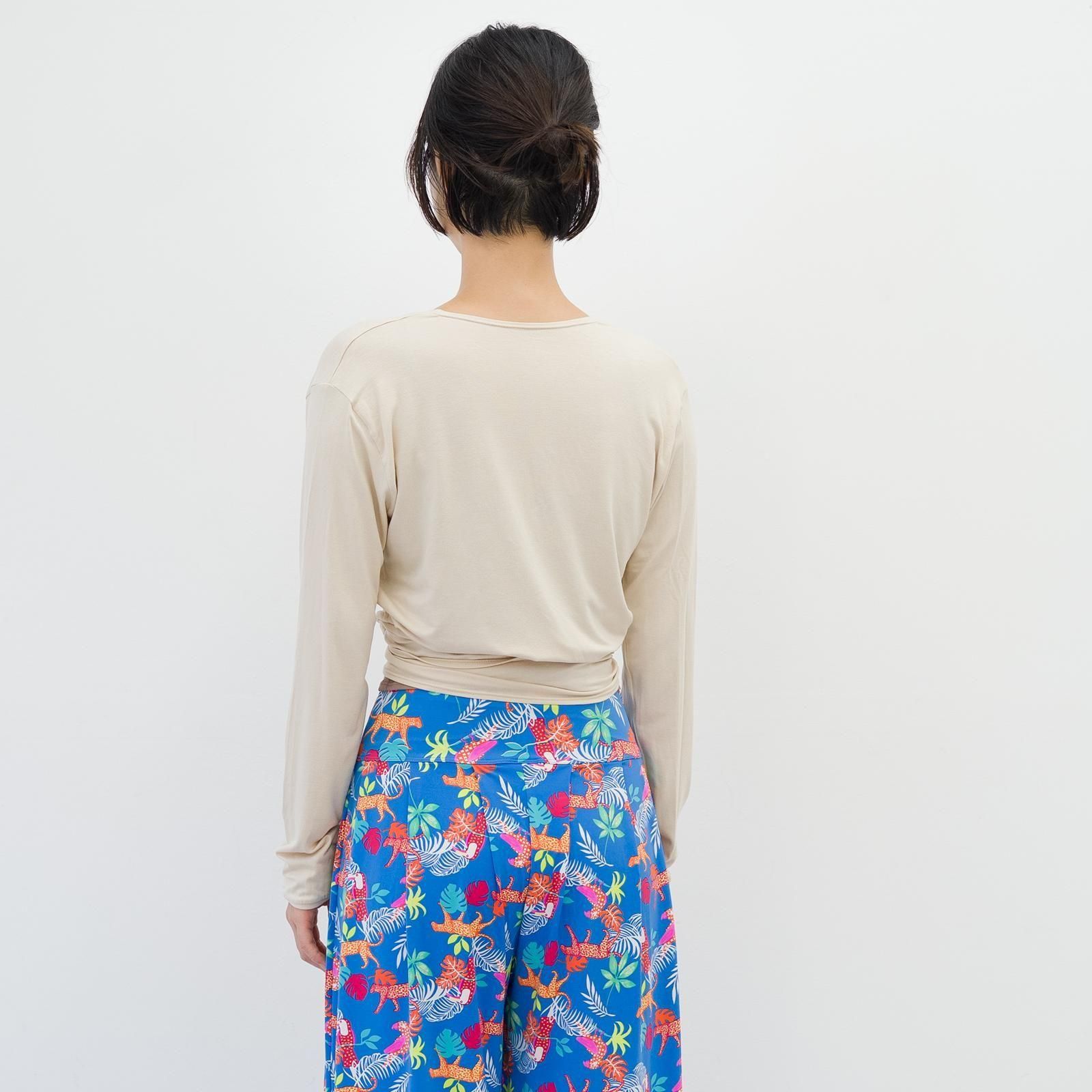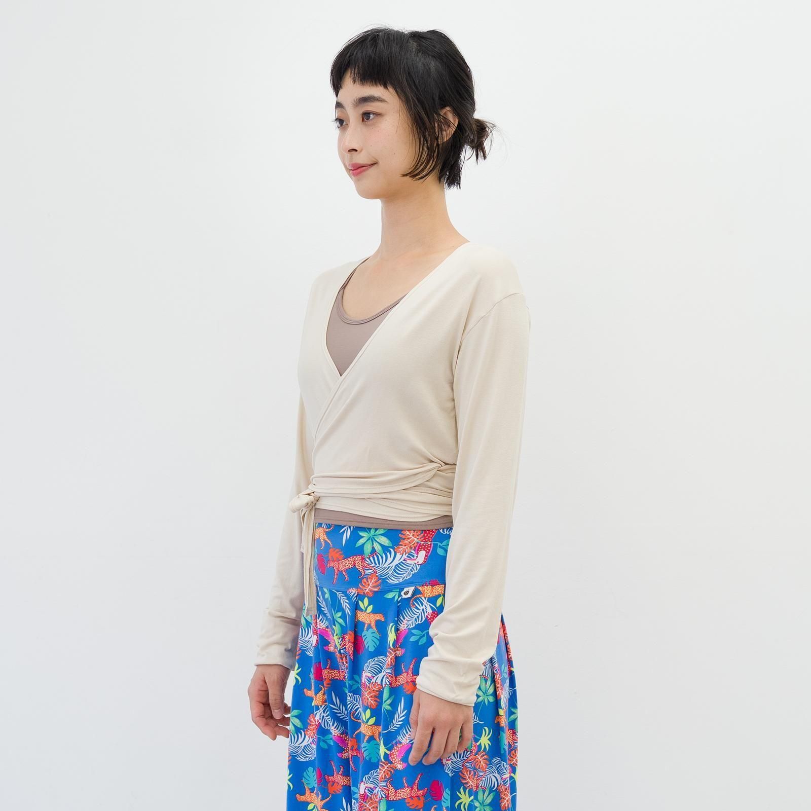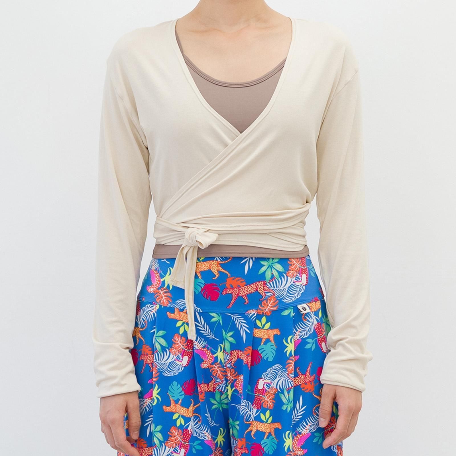 カシュクールタイプの長袖トップス。コンパクトな着丈で動きを妨げない作り。前でも後ろでも結べる仕様なのでお好きな着方を楽しめます。とろみのある柔らな素材は肌触りがよく、伸縮性と通気性に優れています。パッドはついておりませんのでインナーにブラ等をご着用ください。