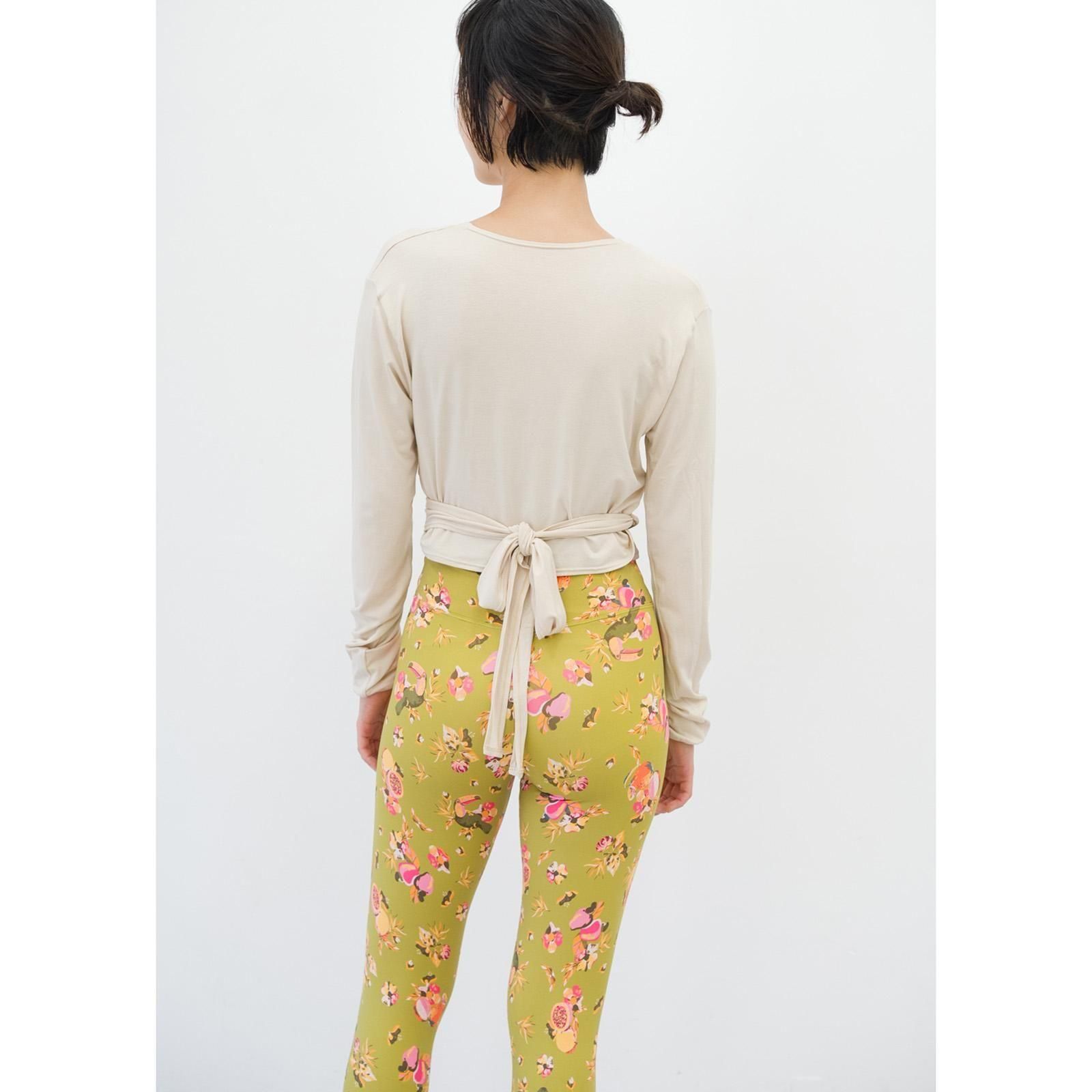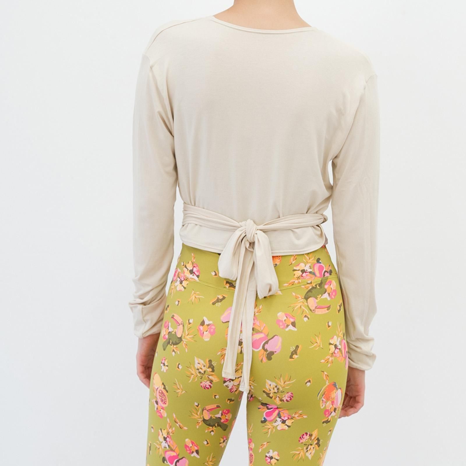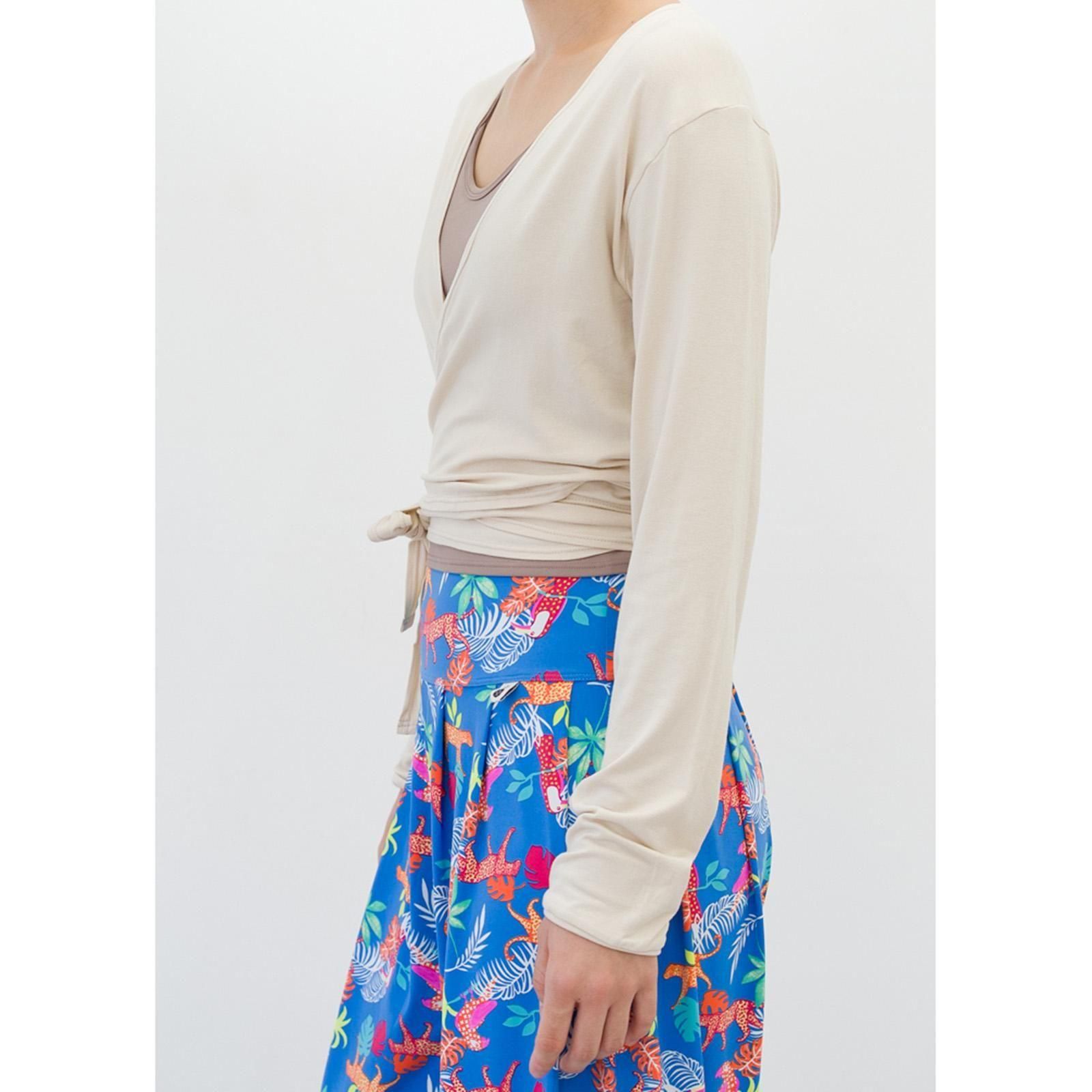 カシュクールタイプの長袖トップス。コンパクトな着丈で動きを妨げない作り。前でも後ろでも結べる仕様なのでお好きな着方を楽しめます。とろみのある柔らな素材は肌触りがよく、伸縮性と通気性に優れています。パッドはついておりませんのでインナーにブラ等をご着用ください。