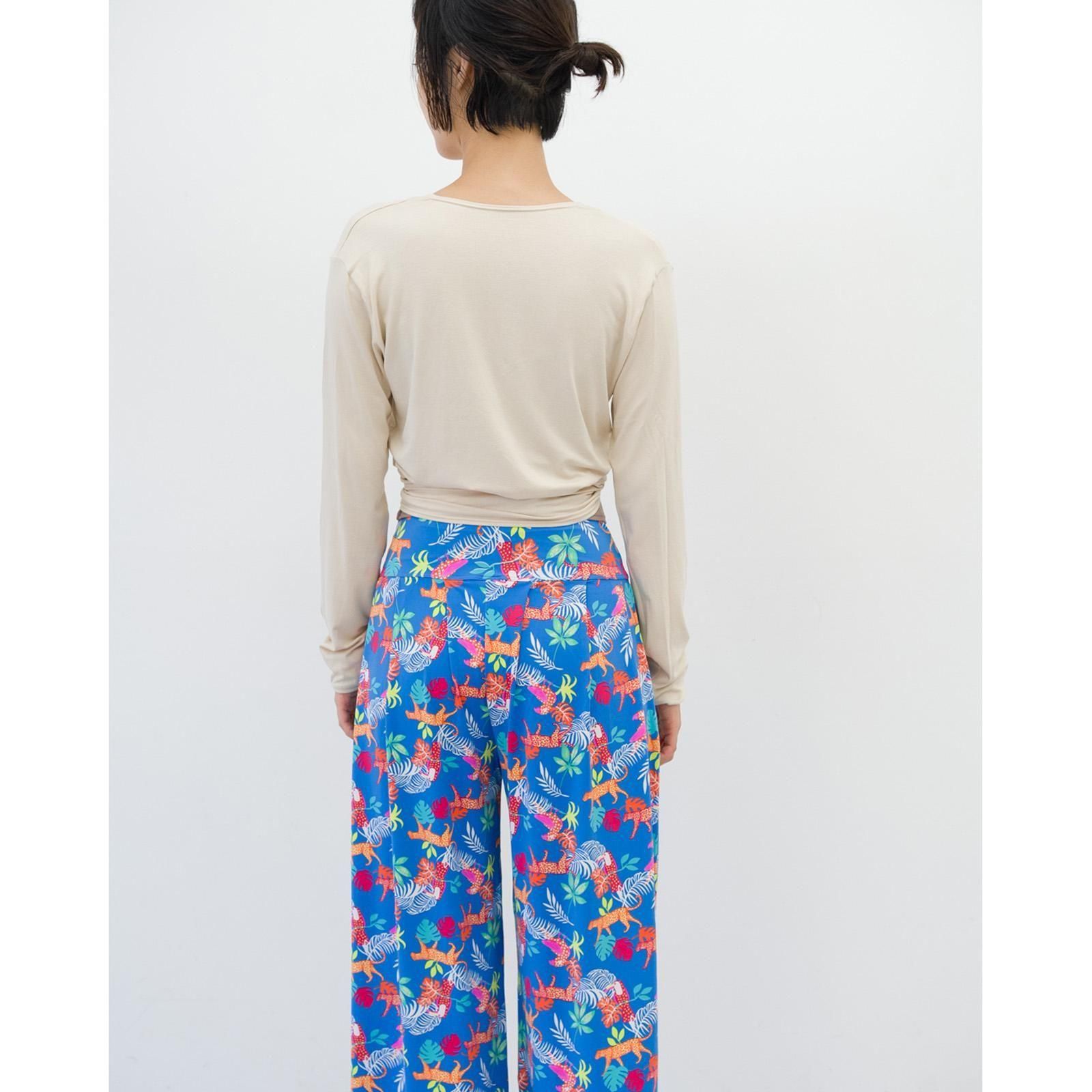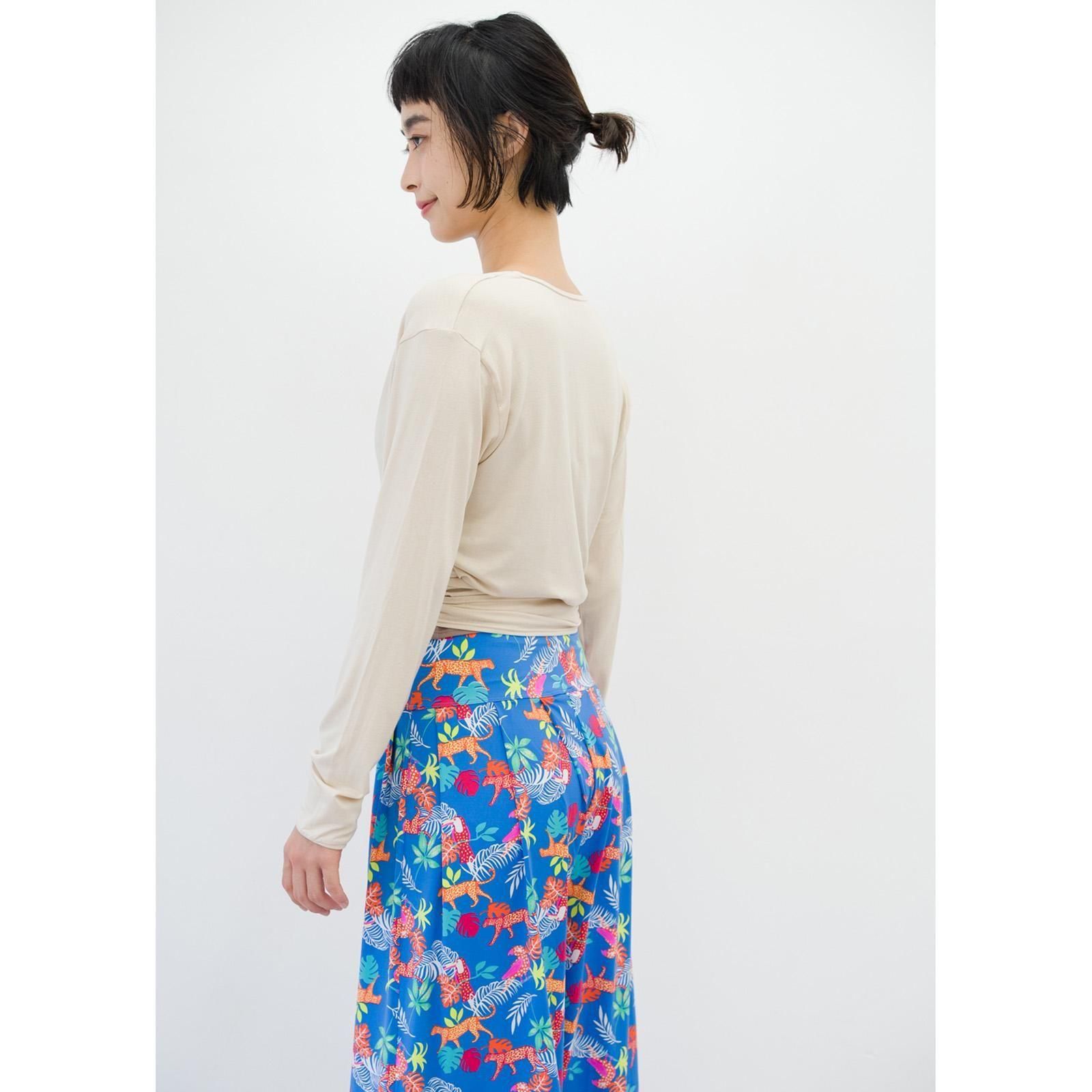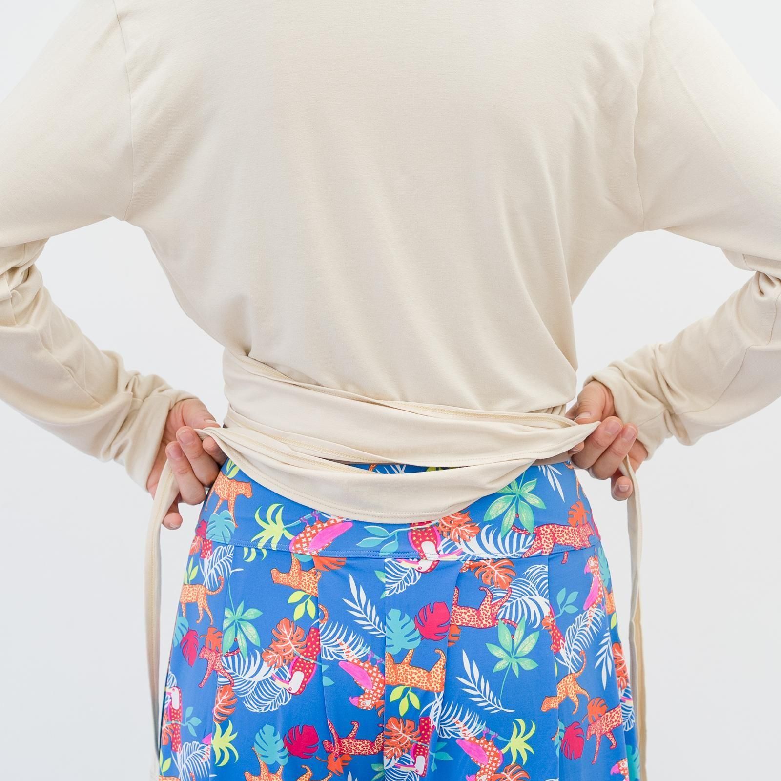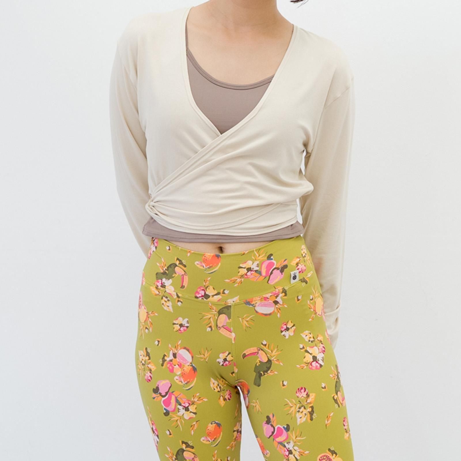 カシュクールタイプの長袖トップス。コンパクトな着丈で動きを妨げない作り。前でも後ろでも結べる仕様なのでお好きな着方を楽しめます。とろみのある柔らな素材は肌触りがよく、伸縮性と通気性に優れています。パッドはついておりませんのでインナーにブラ等をご着用ください。
