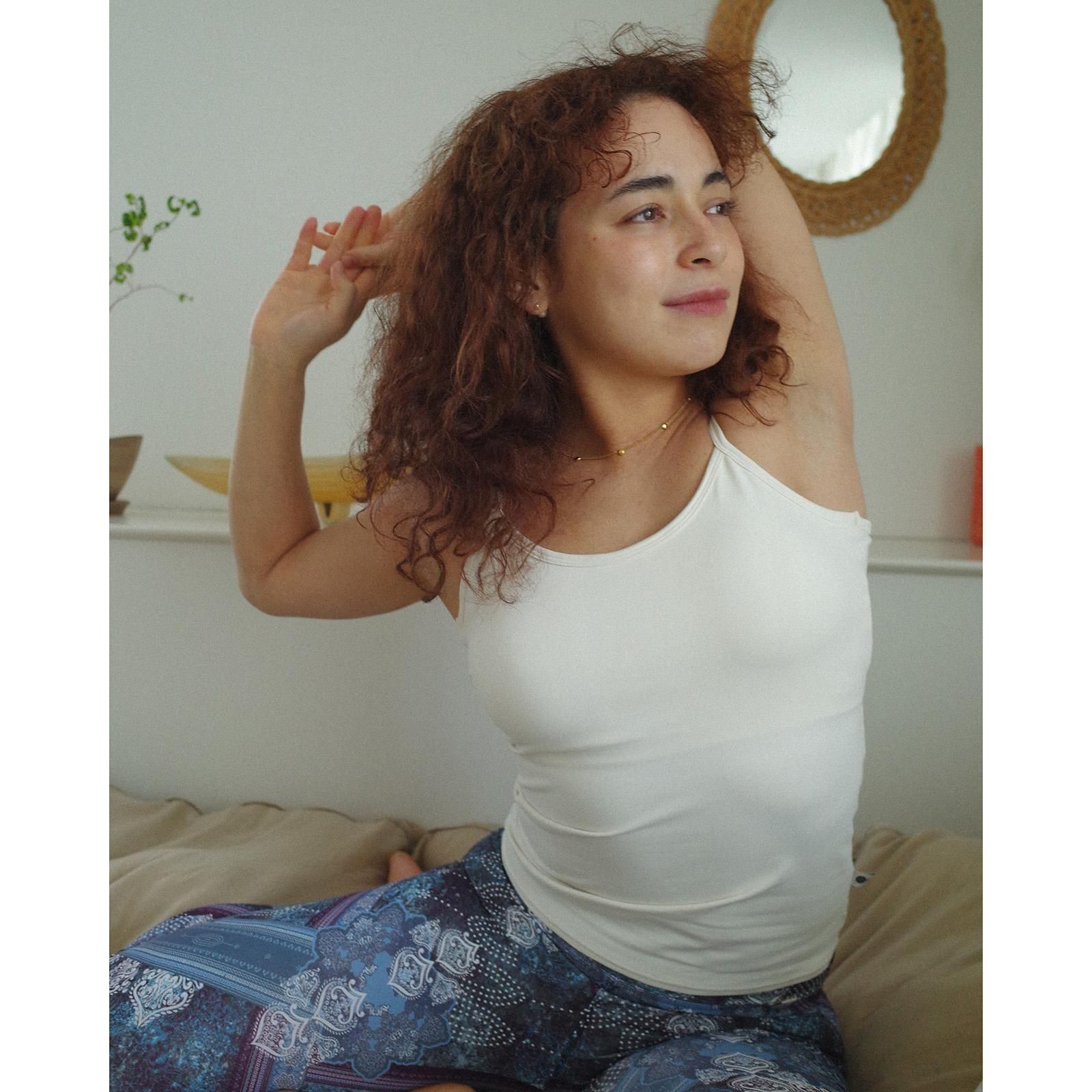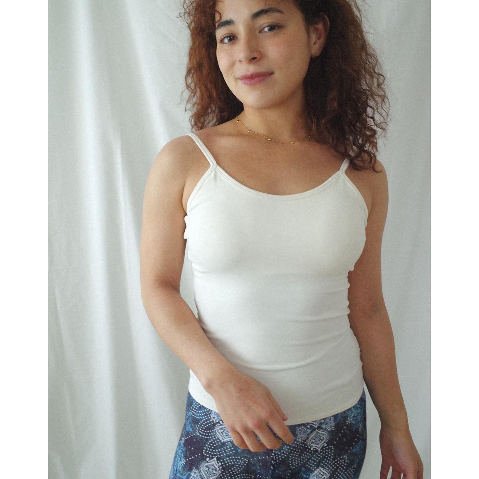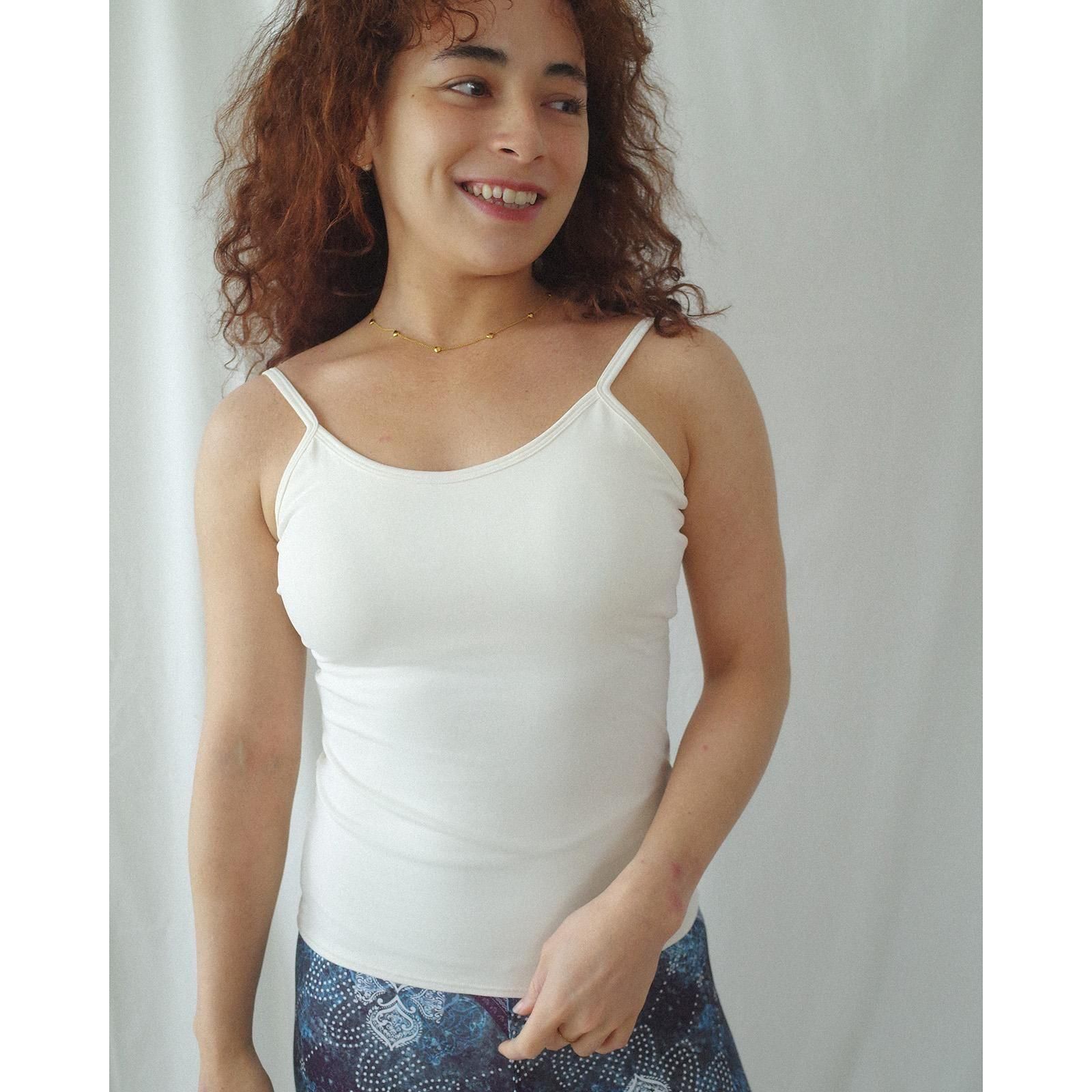 着丈は他のタンクトップに比べて短く、お尻にかからないので邪魔になりません。お腹は出したくないけど丈が長すぎるのもイヤ、という方にピッタリだと思います。
