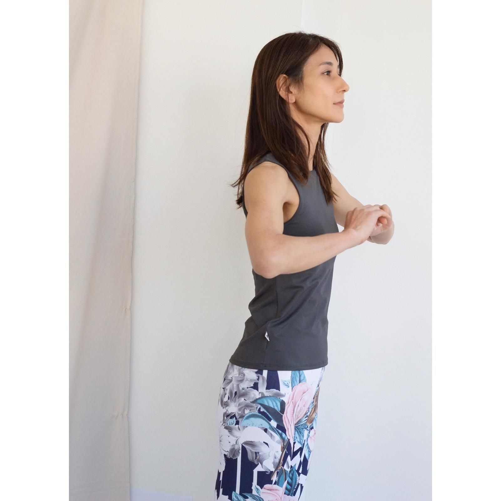 お腹周りはぴったりしすぎず、程よくフィットするサイズ感。胸元も開きすぎないのでポーズに集中できます。