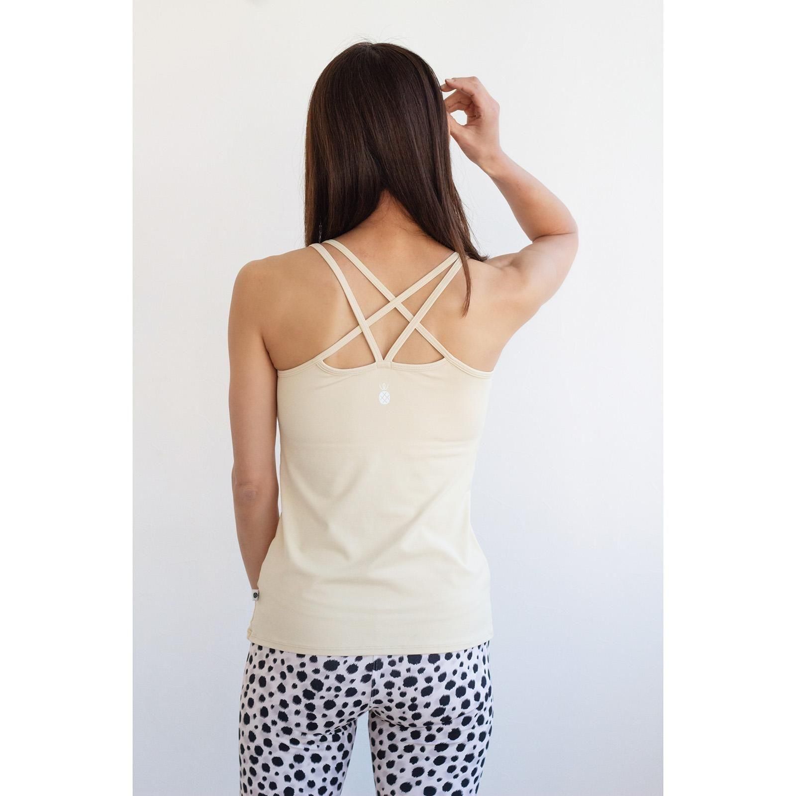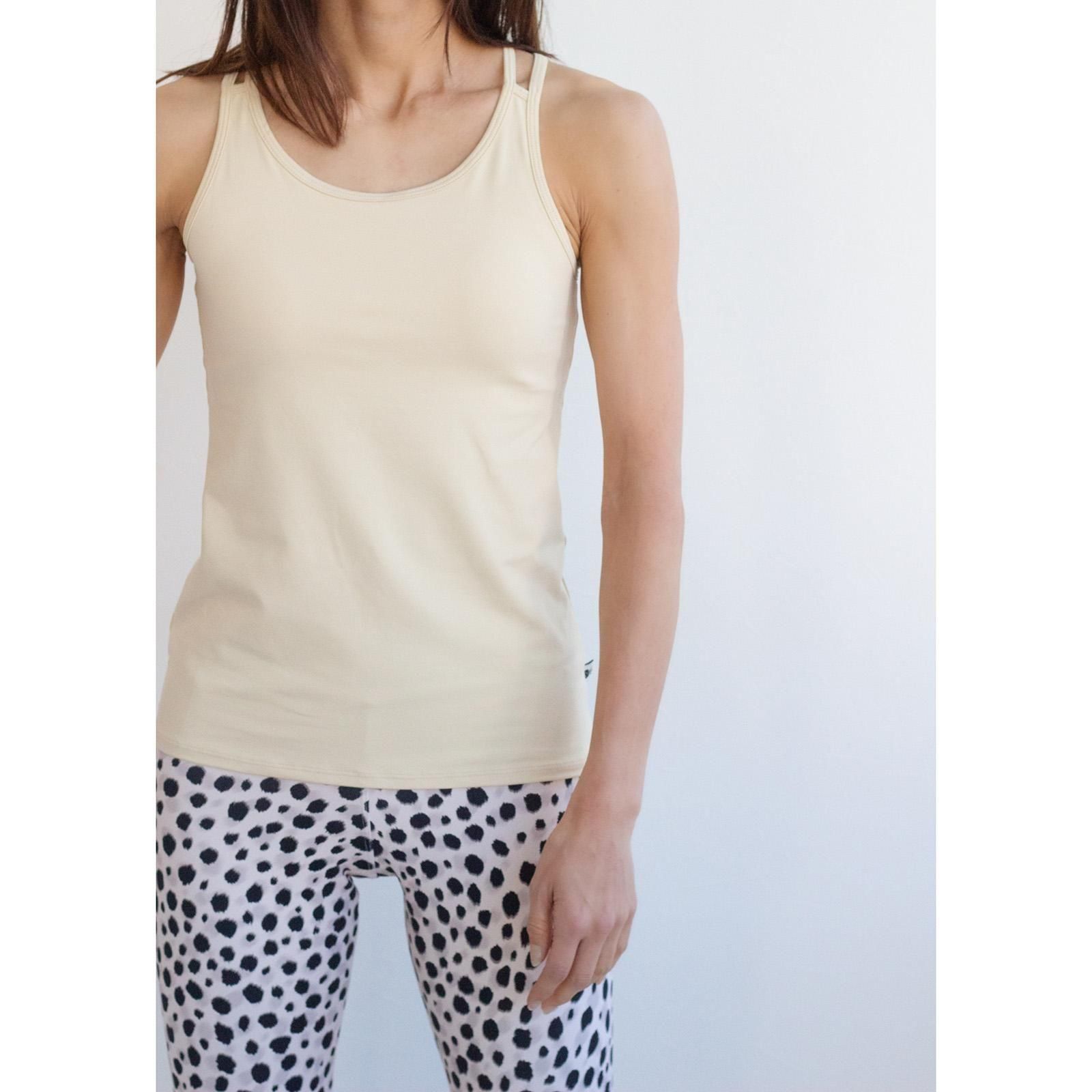 背中のナミナミデザインがポイント。ストラップはズレにくく動きやすい構造にしています。他のタンクトップよりウェスト・お腹周りにゆとりを持って作ったので、ピタッとしすぎるのが苦手な方におすすめです。