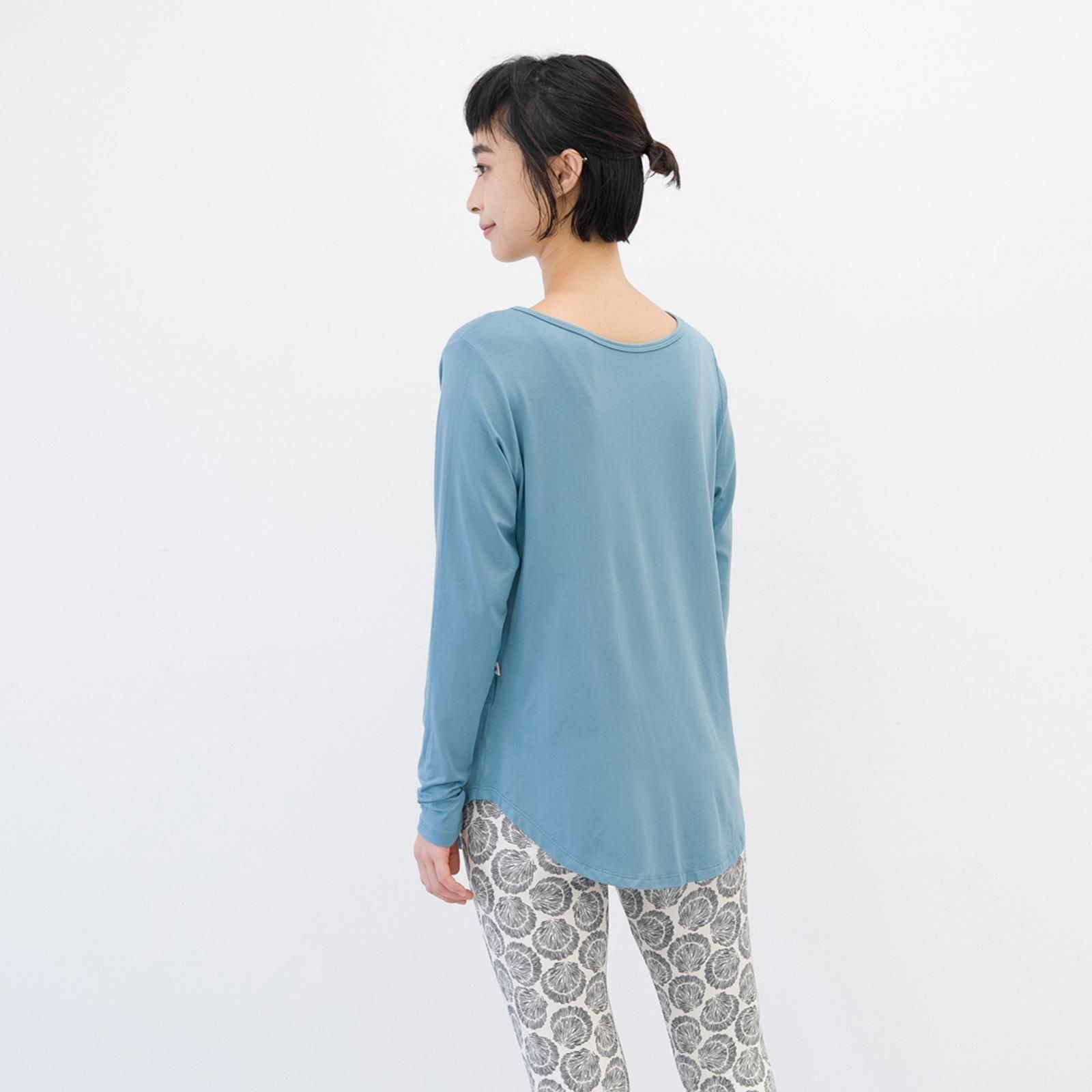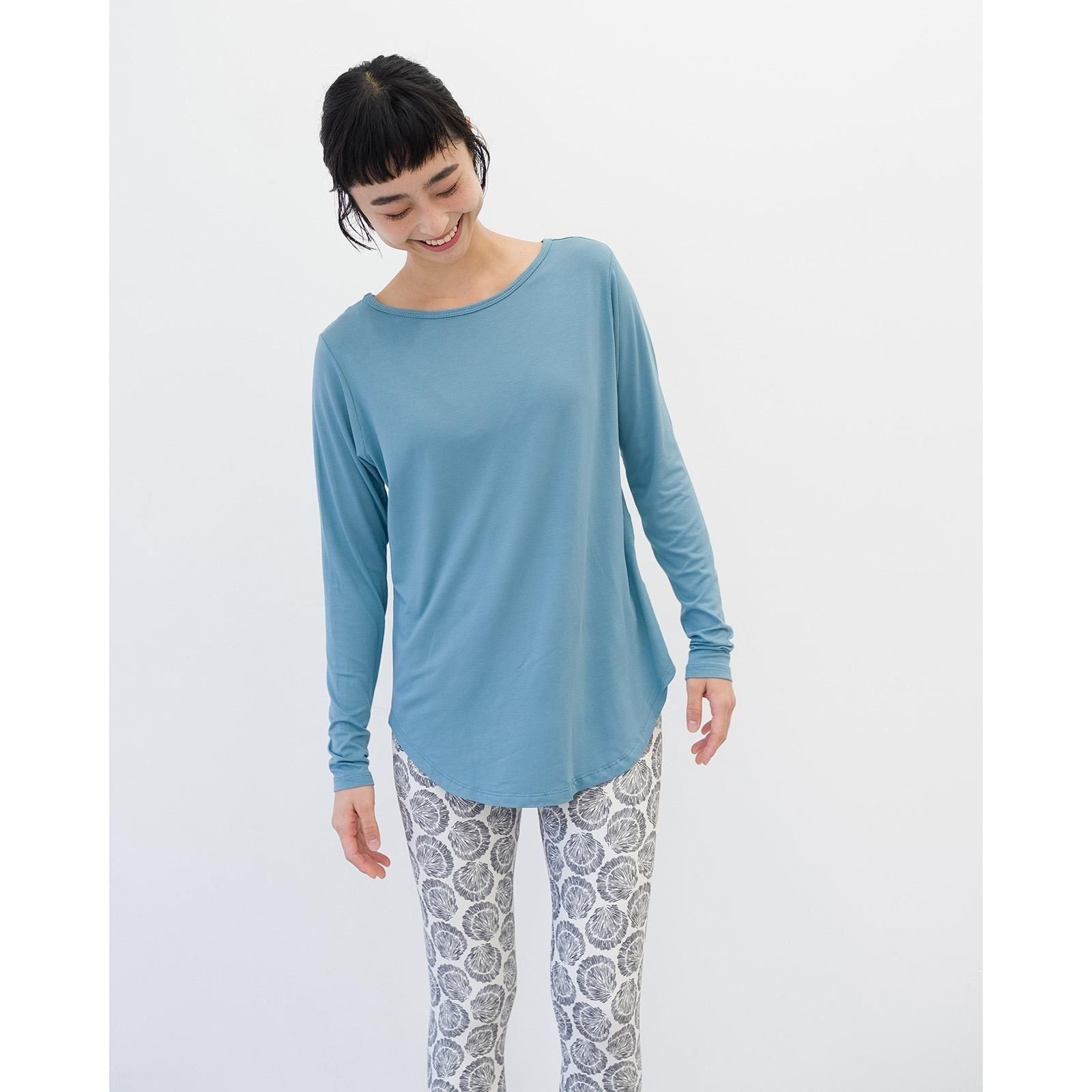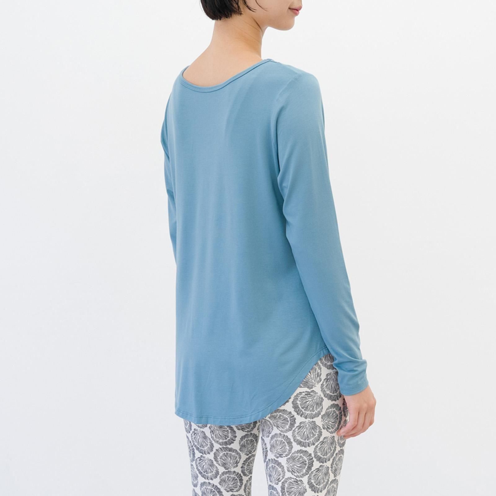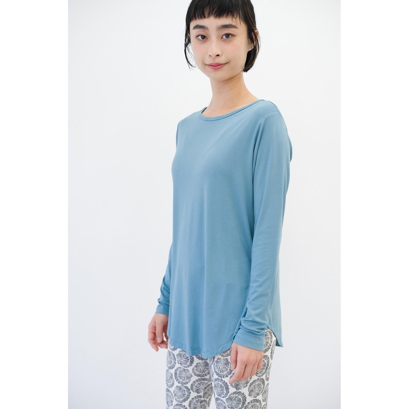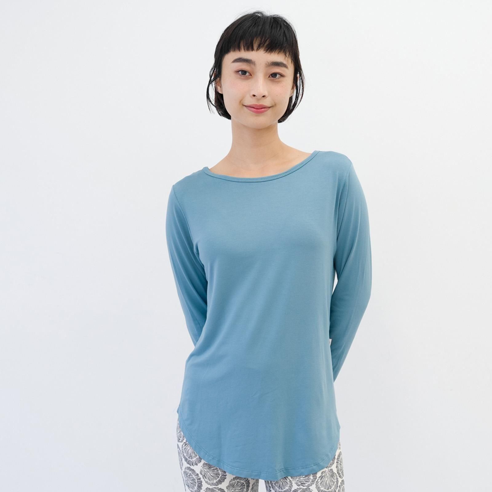 すとんと落ち感のある素材、形がキレイなシンプル長袖Tシャツ。柔らかなレーヨン素材は肌触りがよく、保温性と保湿性に優れています。