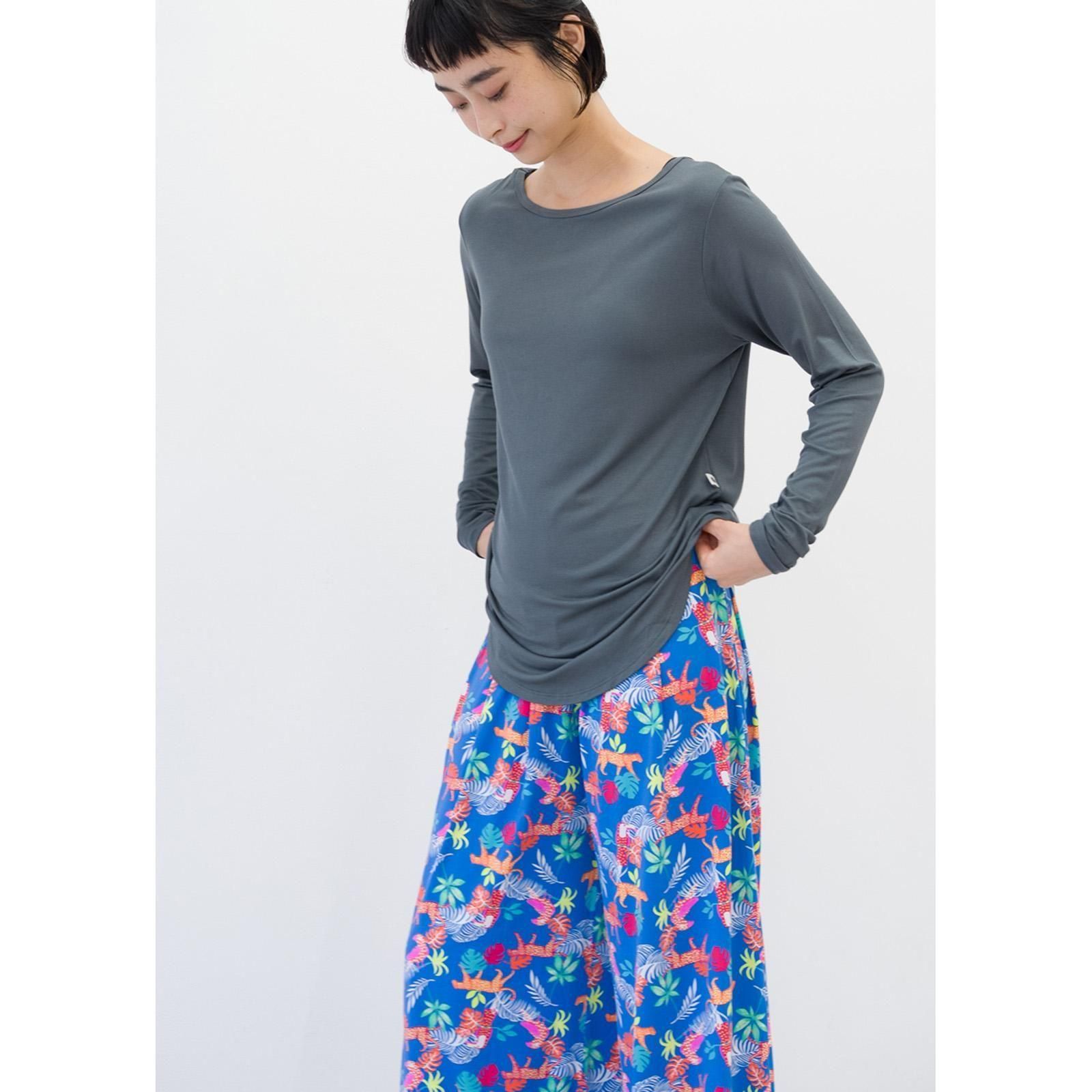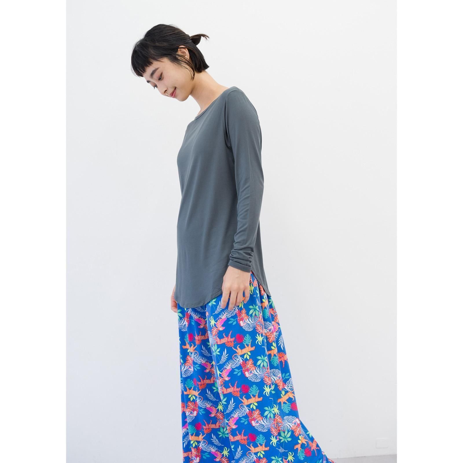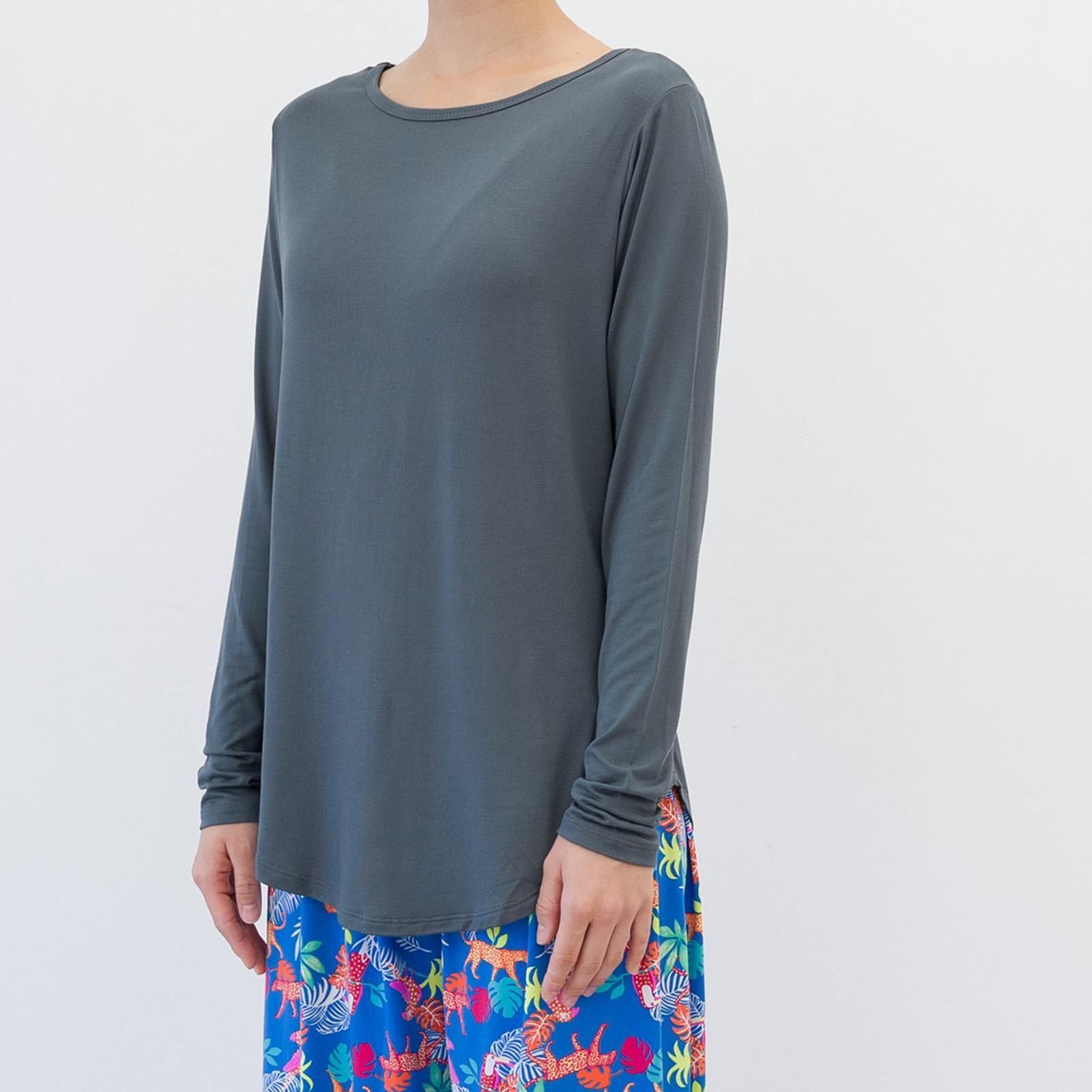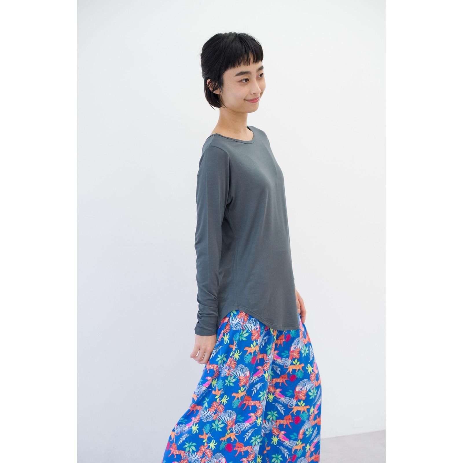すとんと落ち感のある素材、とろみのある着心地がお肌に気持ちいい。形がキレイでどんなスタイルとも合わせやすい、シンプル長袖Tシャツです。お尻が隠れる丈感。腕周りはフィットする作りで、伸縮性が高いので動きやすいです。柔らかなレーヨン素材は肌触りがよく、保温性と保湿性に優れています。パッドはついておりませんのでインナーにブラ等をご着用ください。
