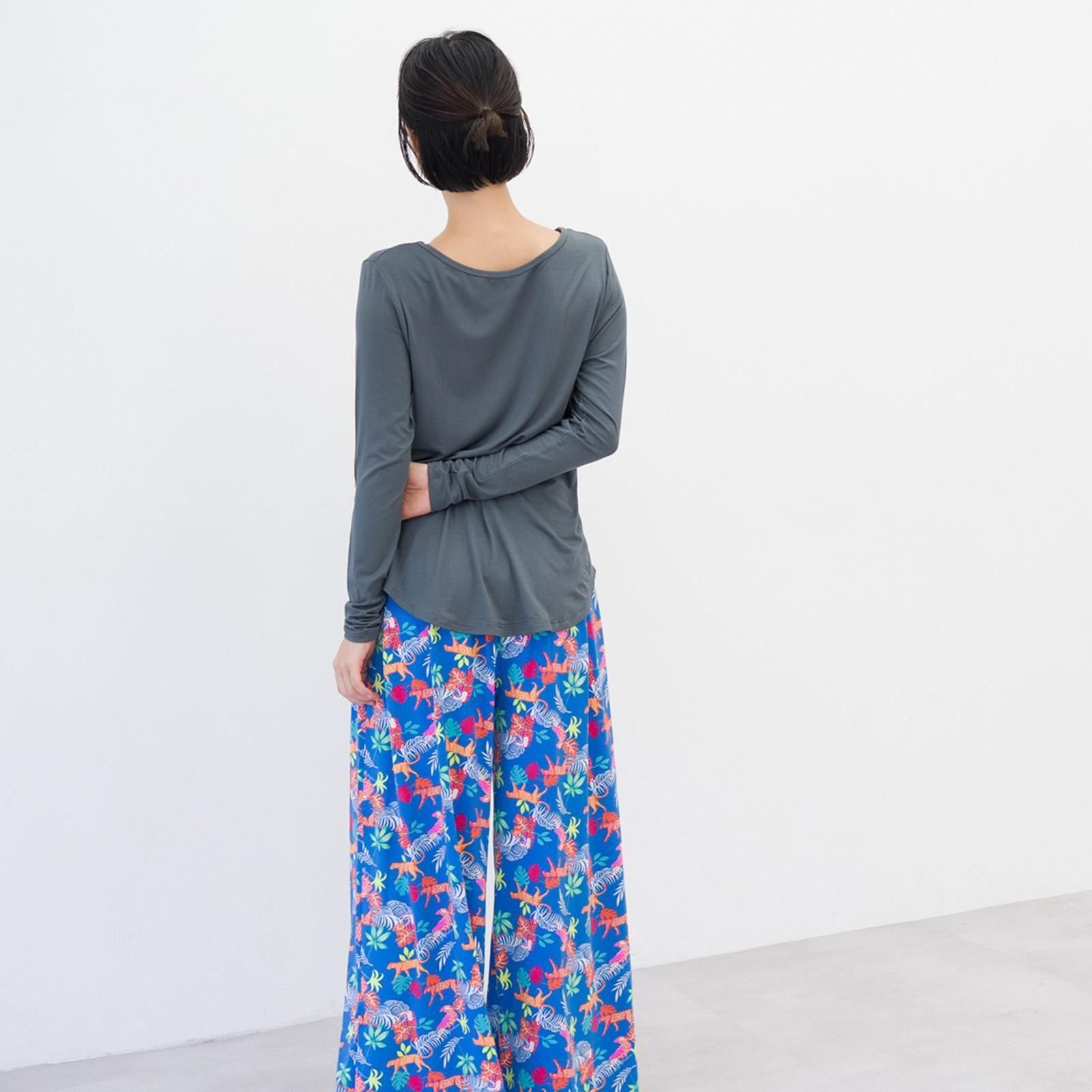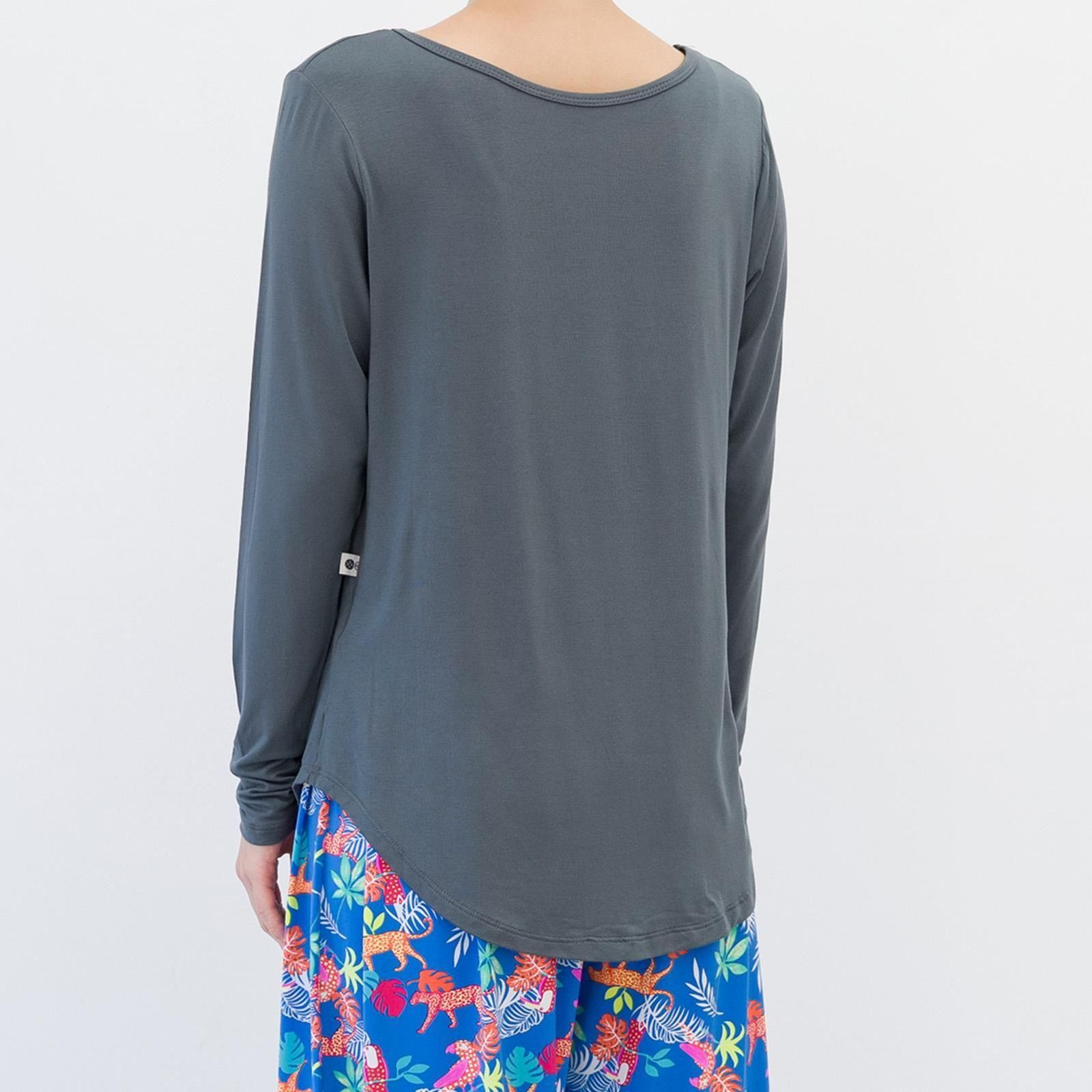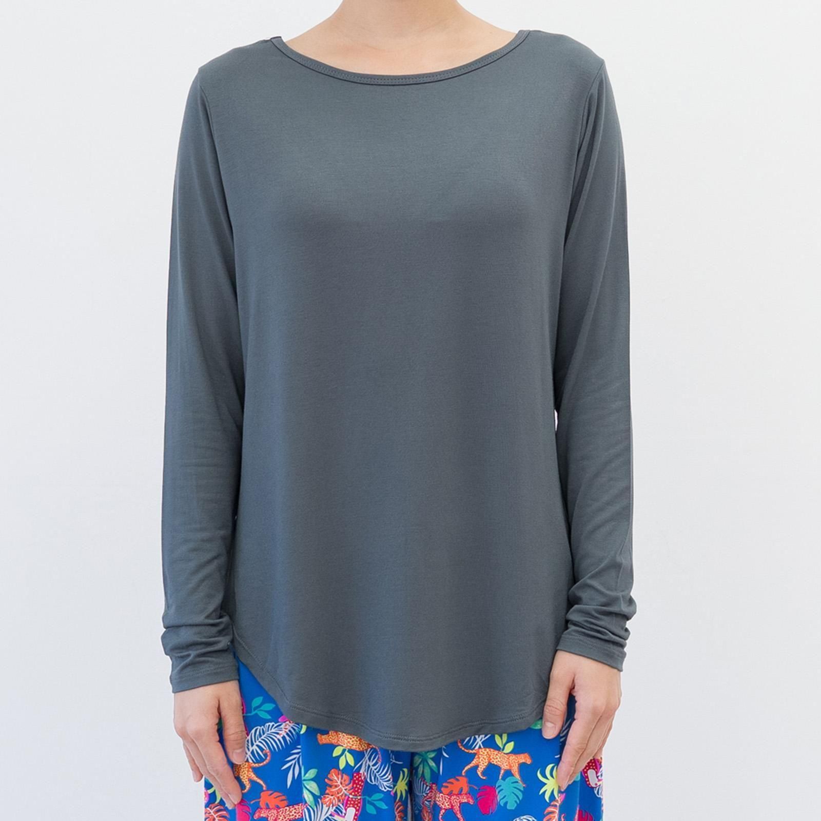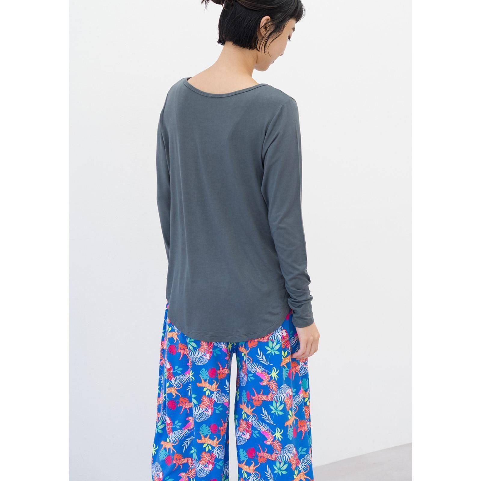 すとんと落ち感のある素材、とろみのある着心地がお肌に気持ちいい。形がキレイでどんなスタイルとも合わせやすい、シンプル長袖Tシャツです。お尻が隠れる丈感。腕周りはフィットする作りで、伸縮性が高いので動きやすいです。柔らかなレーヨン素材は肌触りがよく、保温性と保湿性に優れています。パッドはついておりませんのでインナーにブラ等をご着用ください。
