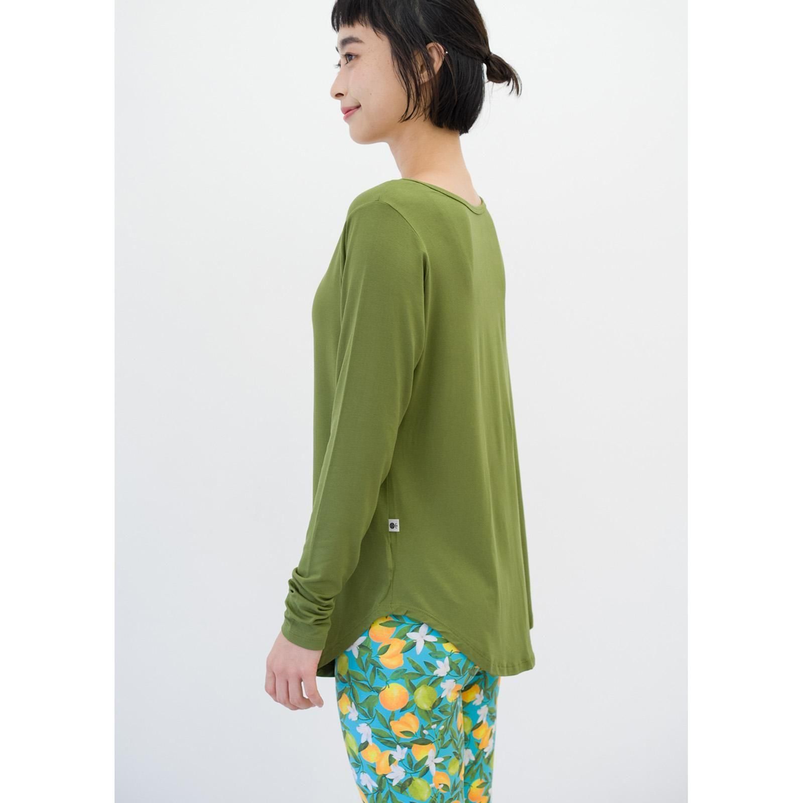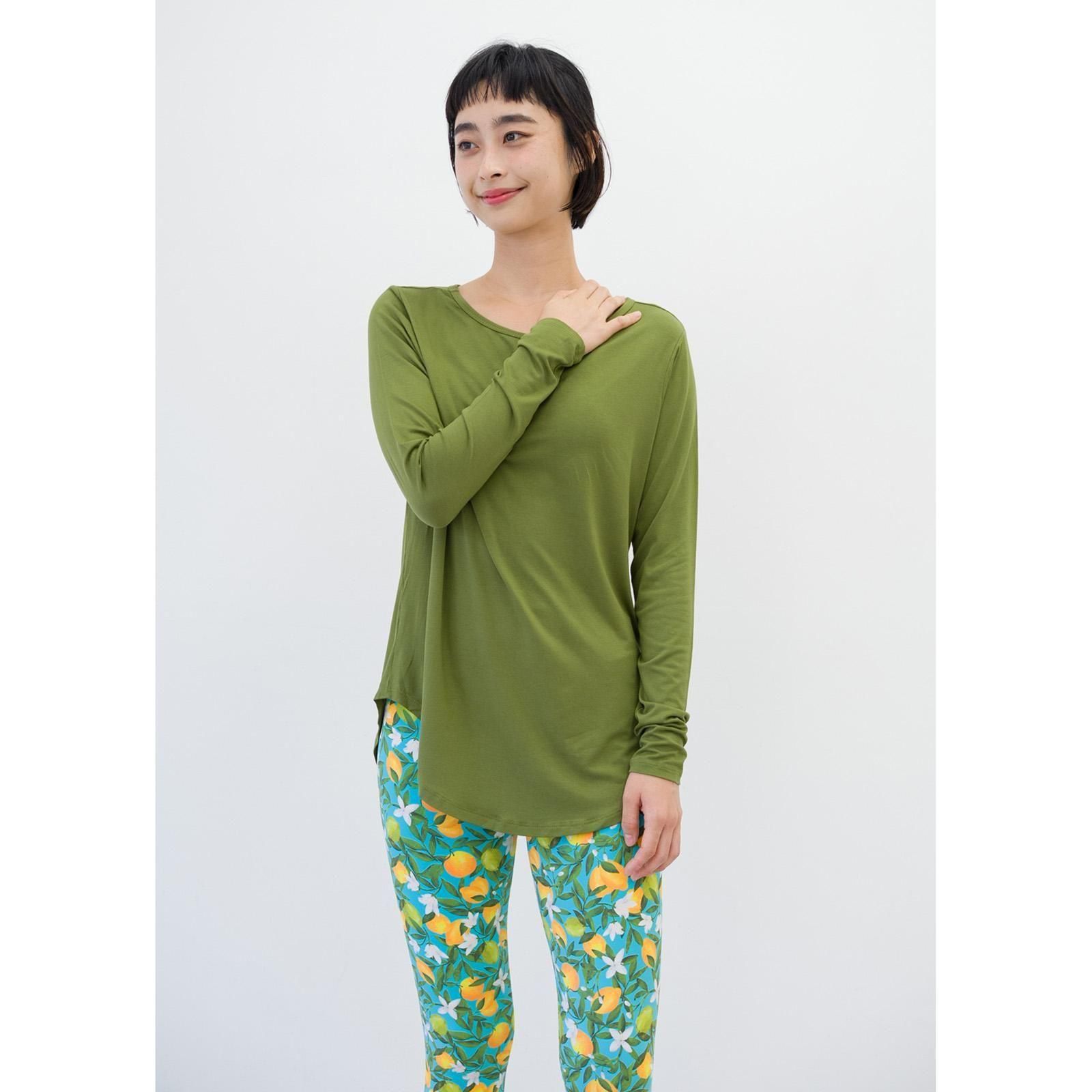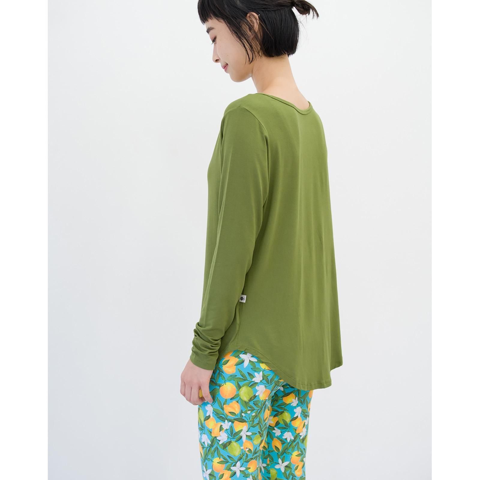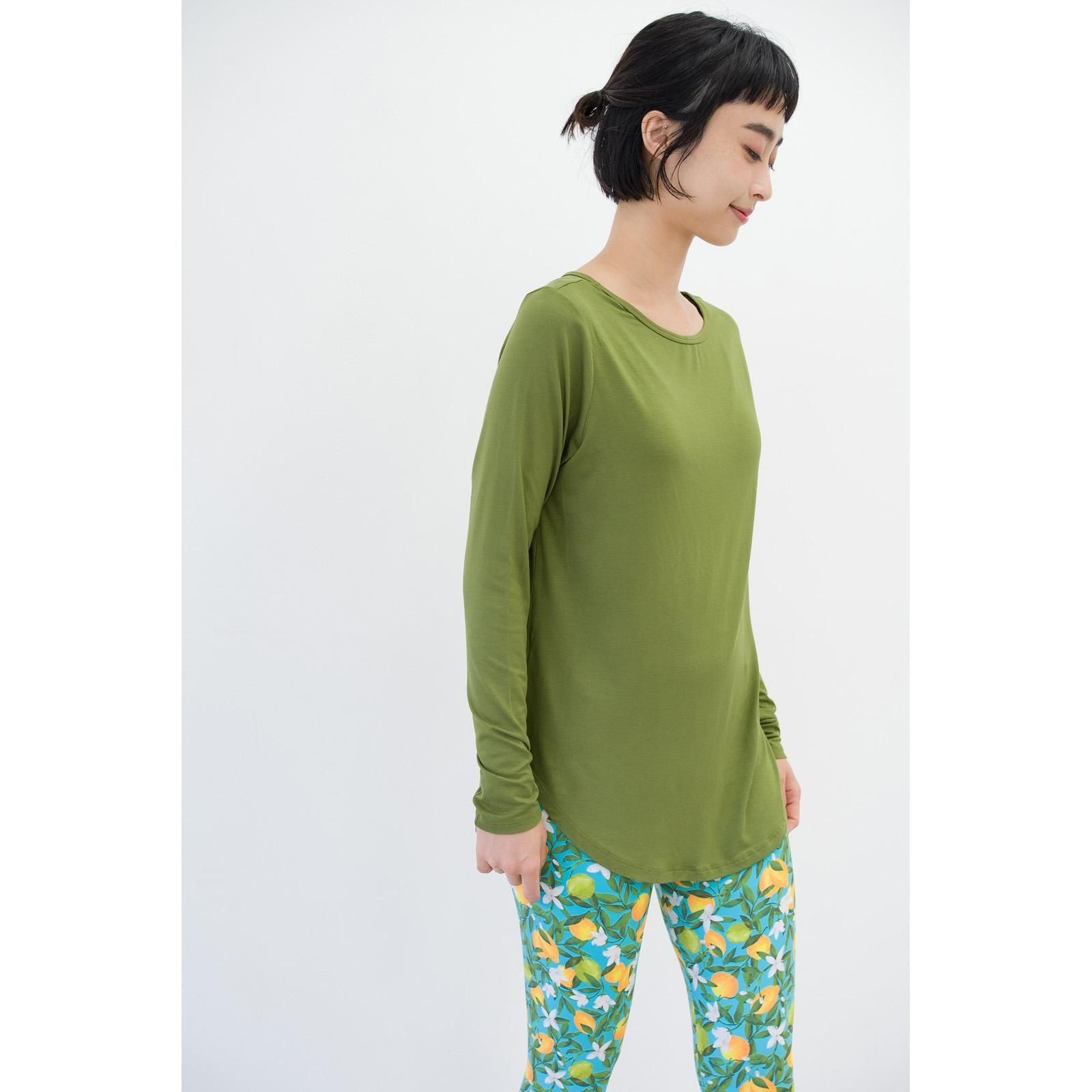 すとんと落ち感のある素材、とろみのある着心地がお肌に気持ちいい。形がキレイでどんなスタイルとも合わせやすい、シンプル長袖Tシャツです。お尻が隠れる丈感。腕周りはフィットする作りで、伸縮性が高いので動きやすいです。柔らかなレーヨン素材は肌触りがよく、保温性と保湿性に優れています。パッドはついておりませんのでインナーにブラ等をご着用ください。