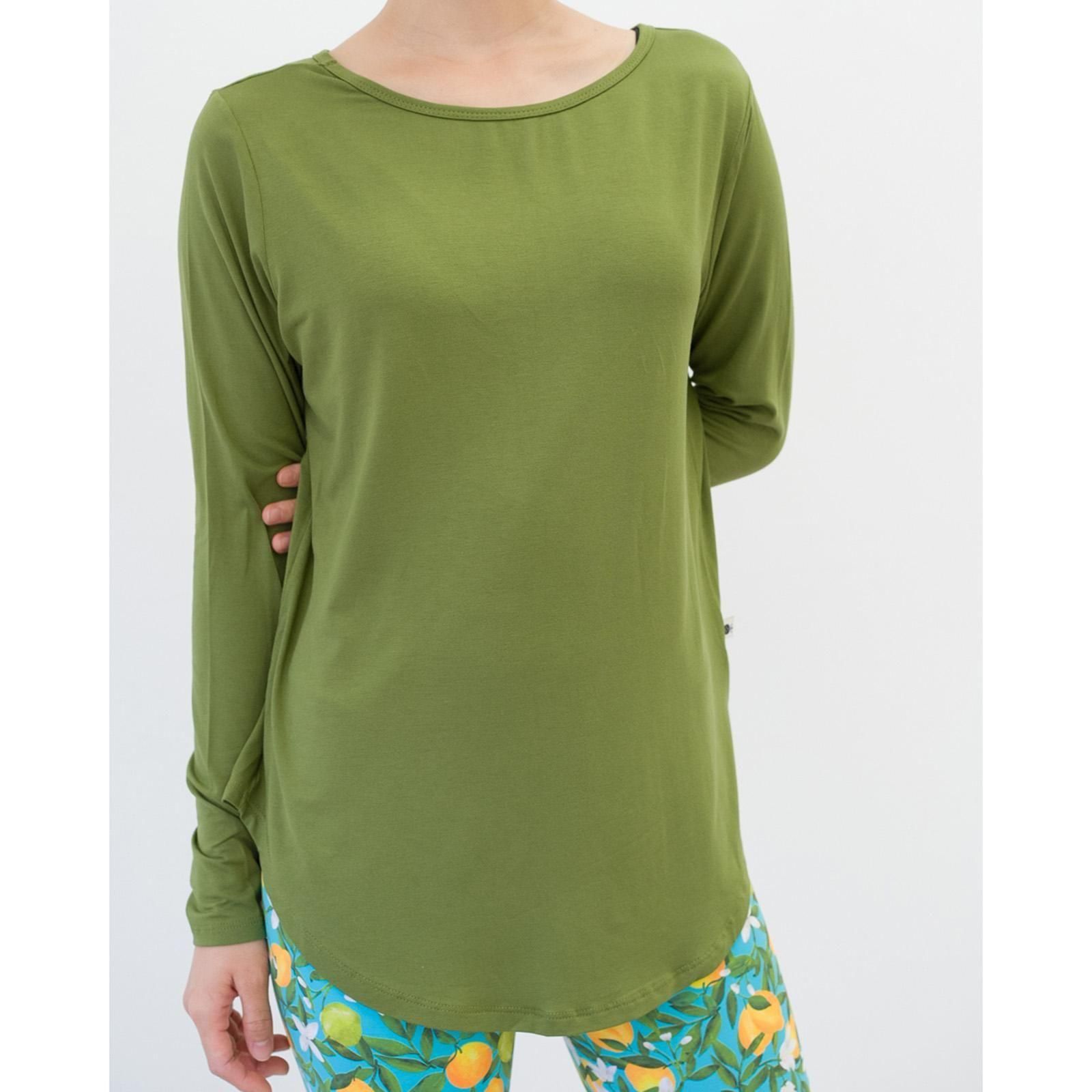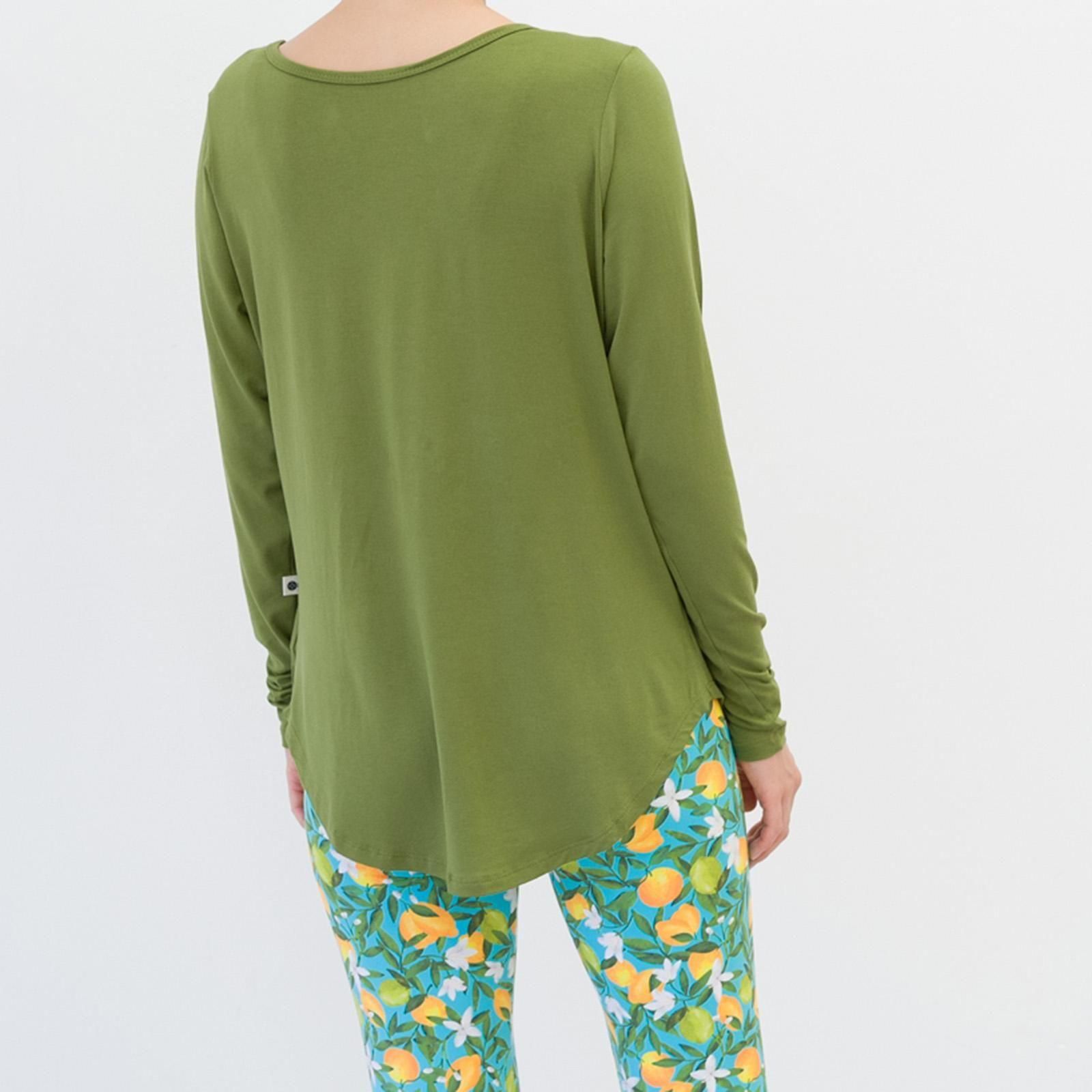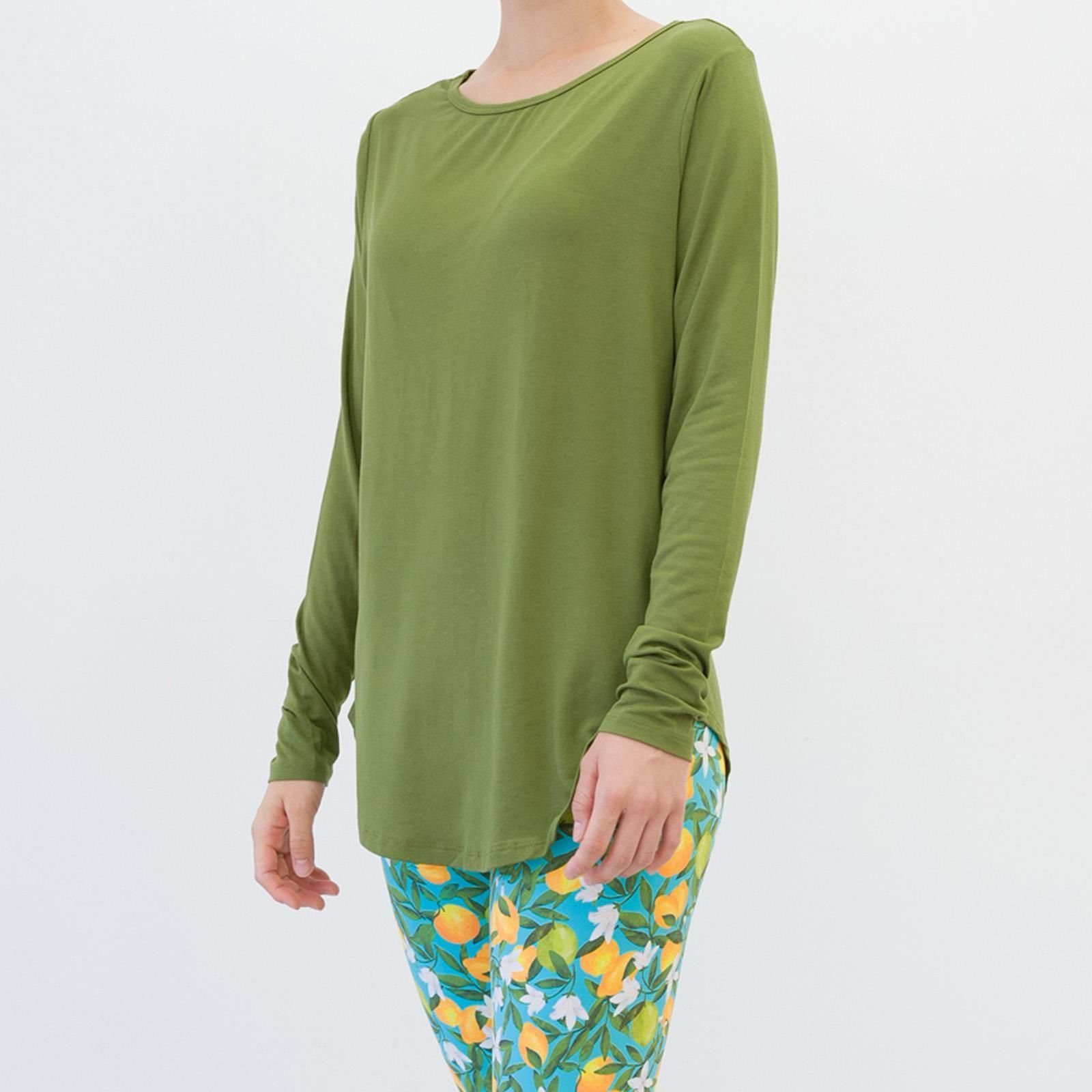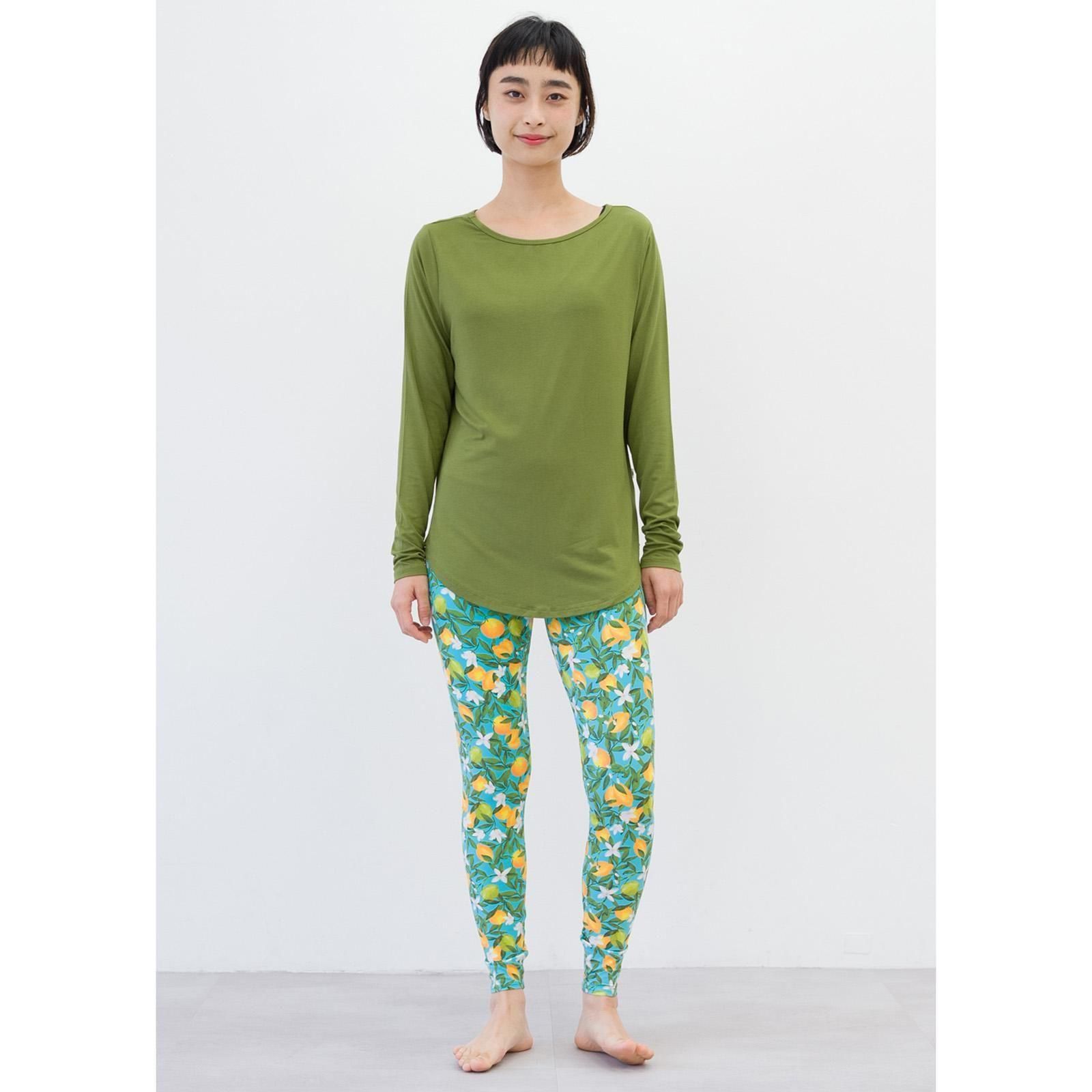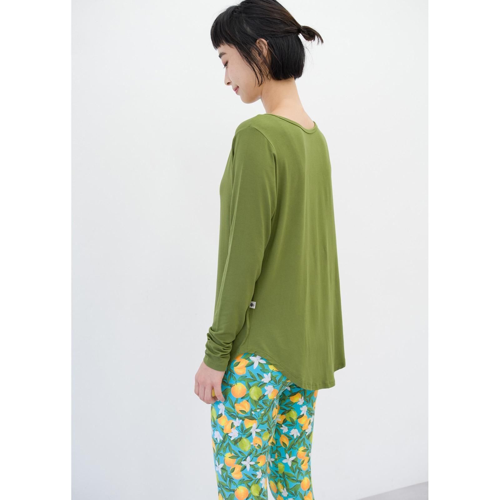 すとんと落ち感のある素材、とろみのある着心地がお肌に気持ちいい。形がキレイでどんなスタイルとも合わせやすい、シンプル長袖Tシャツです。お尻が隠れる丈感。腕周りはフィットする作りで、伸縮性が高いので動きやすいです。柔らかなレーヨン素材は肌触りがよく、保温性と保湿性に優れています。パッドはついておりませんのでインナーにブラ等をご着用ください。