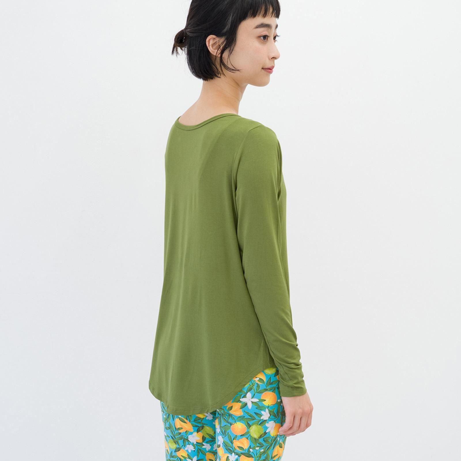 すとんと落ち感のある素材、形がキレイなシンプル長袖Tシャツ。柔らかなレーヨン素材は肌触りがよく、保温性と保湿性に優れています。